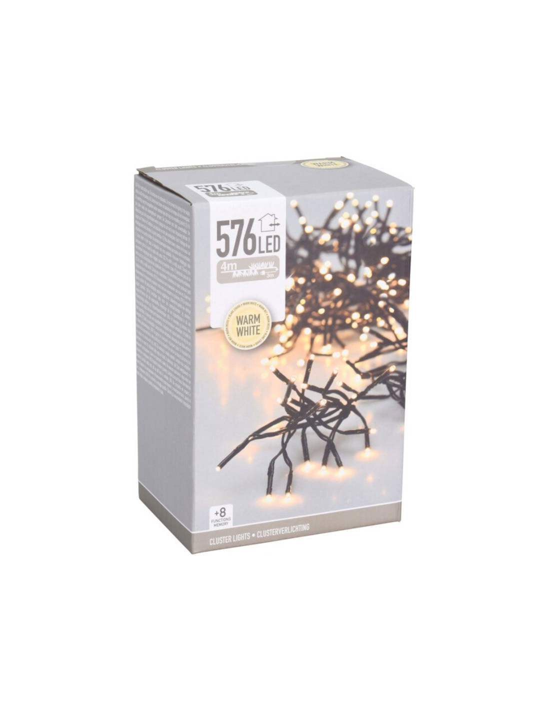 een clustersnoer waarbij de LED lampjes nog dichter bij elkaar zitten dan bij de standaard clusterverlichting, met maar liefst 576 energiezuinige LED's in de kleur warm wit clusterlengte: 4.2 meter, aanloopsnoer 3 meter controller met 8 verschillende functies, het geheugen bewaart de laatst gebruikte instelling met timer: 8 uur aan - 16 uur uit geschikt voor binnen en buiten (beschermwaarde IP44) zwart snoer verbruik: 3.6W 3V, 3mA