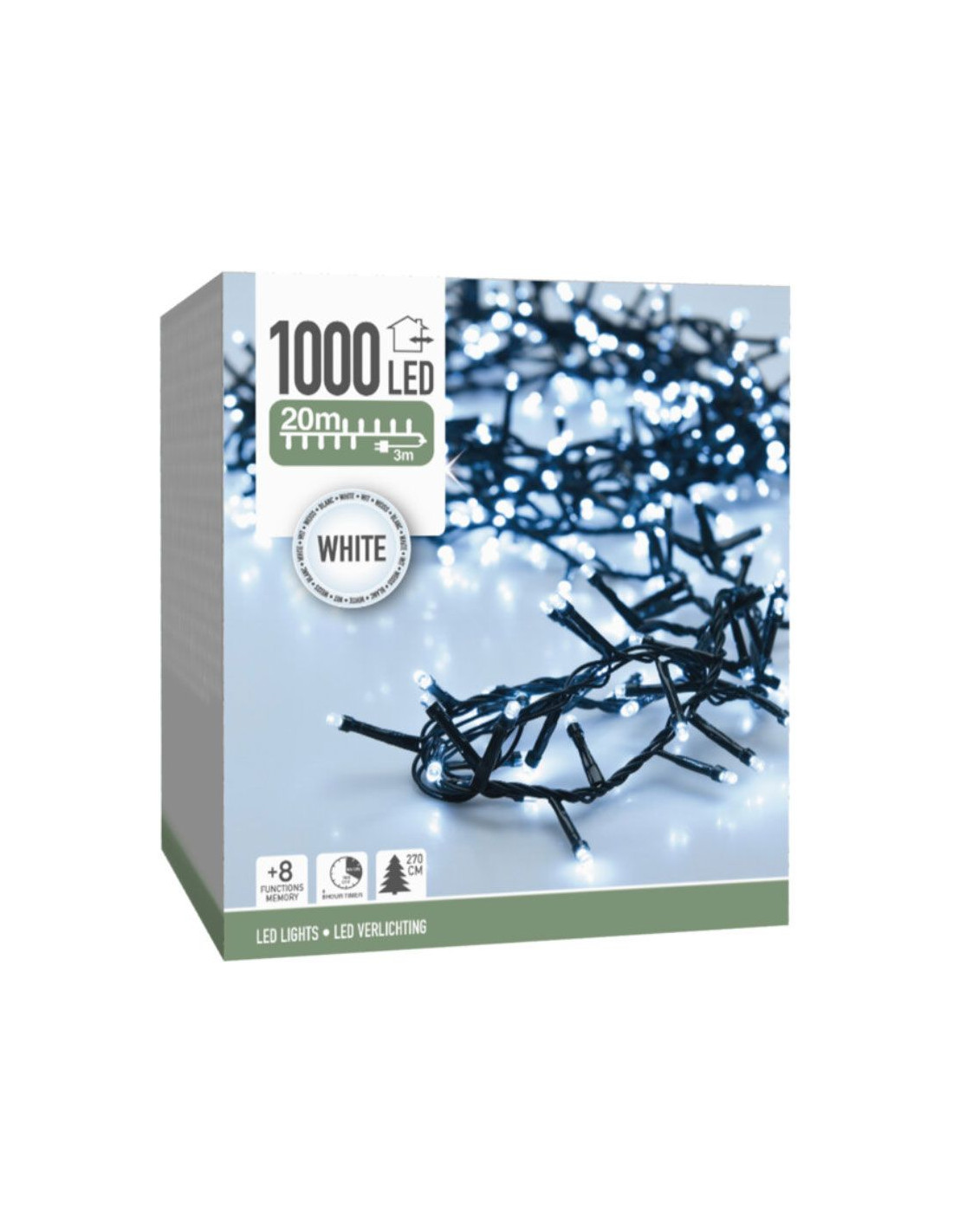 Kerstverlichting van 20 meter met 1000 LED lampjes, geschikt voor een kerstboom van 270 cm, voor binnen en buiten gebruik 1000 led's wit, koelwit 8 lichtfuncties: 1.Combination, 2. In waves, 3.Sequential, 4. Slo glo, 5. Chasing/flash, 6.Slow fade, 7.Twinkle/flash, 8.Steady on geheugen: de laatste gekozen lichtinstelling wordt onthouden timer: 8 uur aan / 16 uur uit verlichte lengte: 2000 cm aanloopsnoer: 300 cm groen snoer lengte takjes: 3 cm afstand tussen de takjes: 2 cm IP44 adapter: voor binnen en buiten zuinig in verbruik: 6W