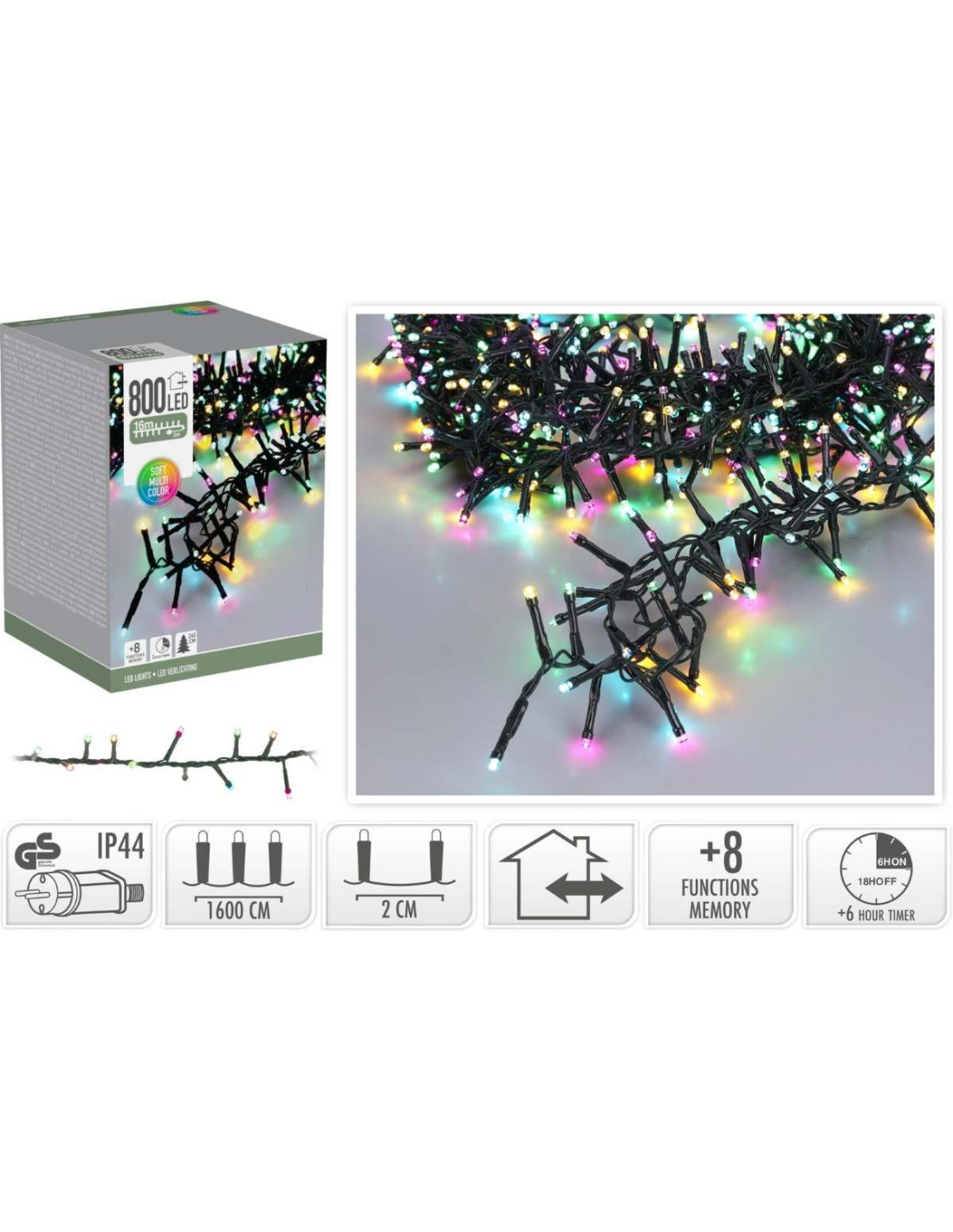800 led's soft multi color, veelkleurig 8 lichtfuncties: 1.Combination, 2. In waves, 3.Sequential, 4. Slo glo, 5. Chasing/flash, 6.Slow fade, 7.Twinkle/flash, 8.Steady on geheugen: de laatste gekozen lichtinstelling wordt onthouden timer: 8 uur aan / 16 uur uit verlichte lengte: 1600 cm geschikt voor een kerstboom van 240 cm aanloopsnoer: 300 cm groen snoer lengte takjes: 3 cm afstand tussen de takjes: 2 cm IP44 adapter: voor binnen en buiten zuinig in verbruik: 3.6W