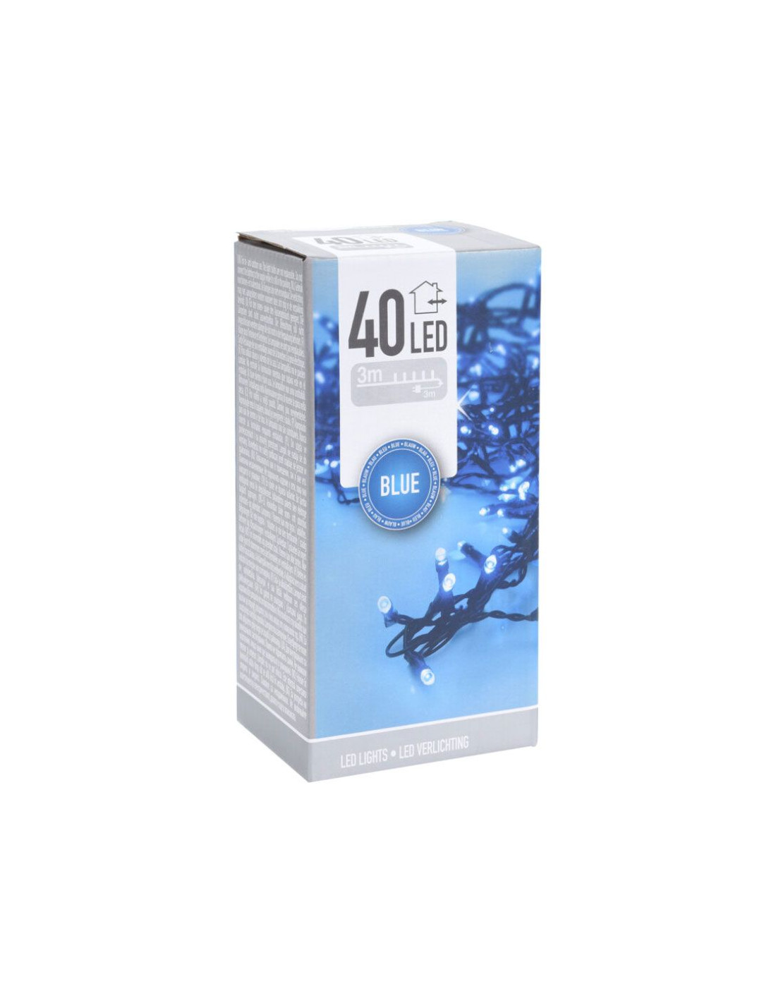 LED Lichtsnoer 3 meter, 40 lampjes, voor binnen en buiten Aantal LED's: 40 Afstand tussen LED's: 7.5 cm Lengte aanloopsnoer: 3 meter Lengte lichtsnoer: ca. 3 meter Lengte totaal: ca. 6 meter Kleur LED: blauw Kleur snoer: groen Met adapter (beschermwaarde IP44) Geschikt voor binnen en buiten Verbruik: 1.1W