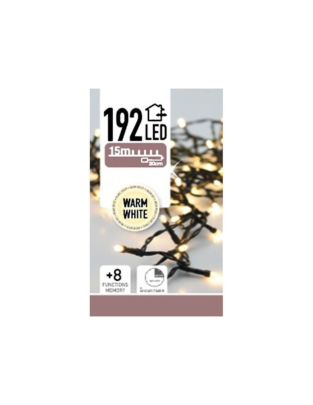 LED lichtsnoer met 192 LED lampjes in de kleur warm wit De controller heeft 8 verschillende functies Met 6-18uurs timer, na 6 uur schakelt de verlichting automatisch uit, na 18 uur zal die weer automatisch inschakelen De lampjes zitten om de 7.5 cm, de lengte van het lichtsnoer is ca. 14.50 meter, dit is excl. het aansluitsnoer van 50 cm. Zwart snoer Werkt op 3x AA batterijen (niet meegeleverd)