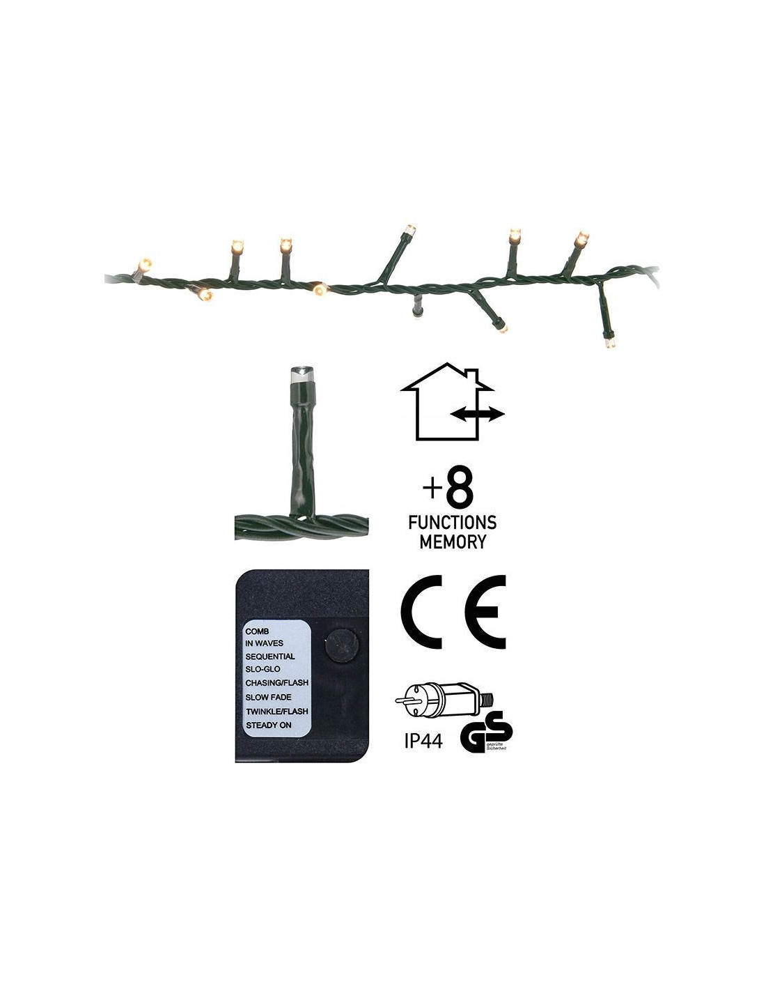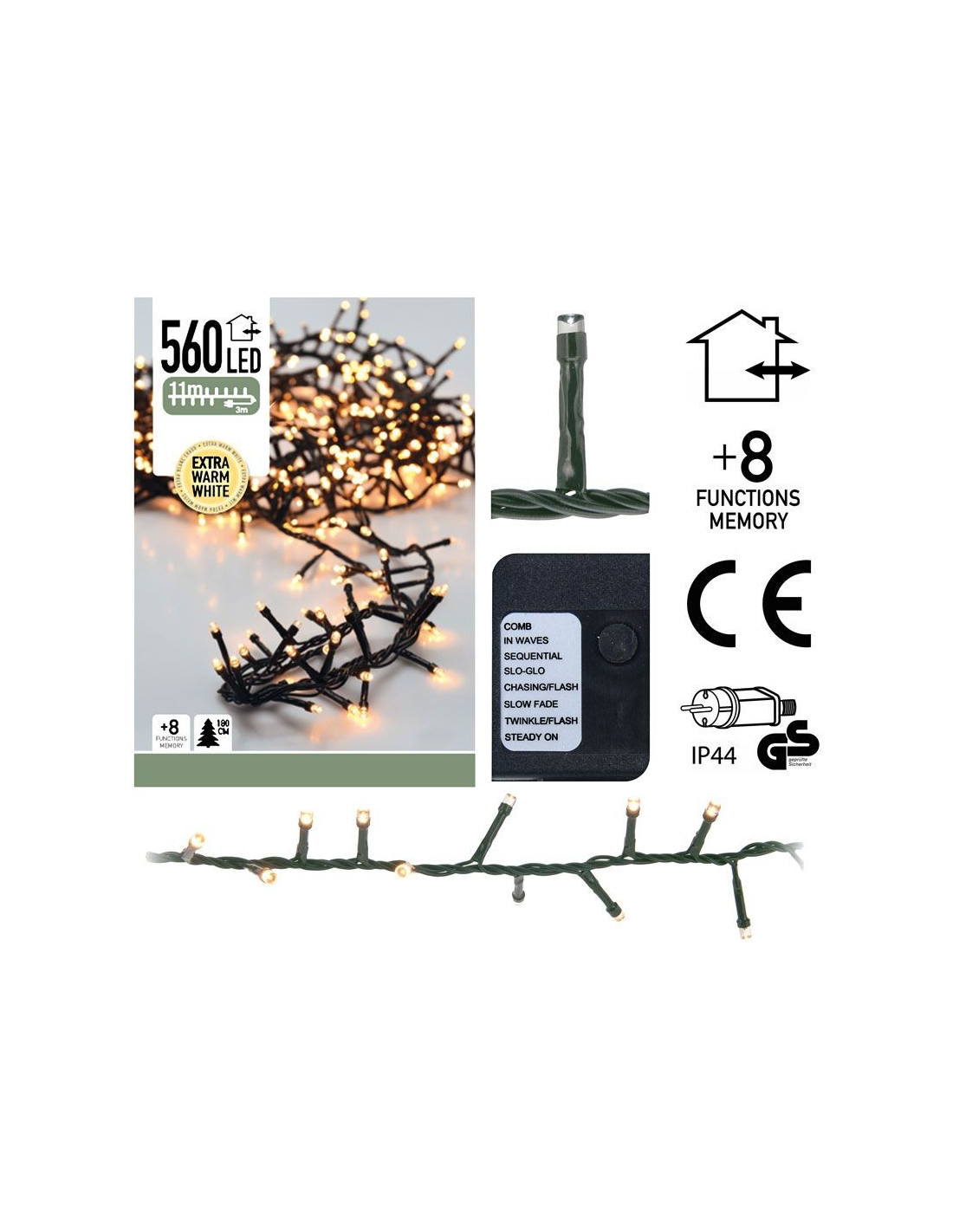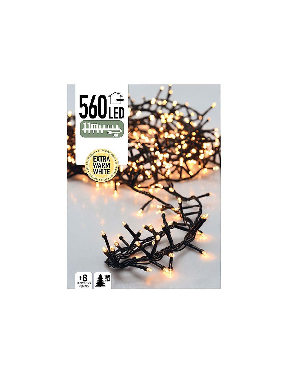 Kerstverlichting 11 meter, 560 LED lampjes, binnen en buiten Met een lengte van 11 meter is deze clusterverlichting geschikt voor een boom van 180cm Clustersnoeren zijn ook prima geschikt om sfeervolle lichteffecten te creëren bij een schutting, een afdakje, een meubelstuk enz. Met maar liefst 560 energiezuinige LED's in de kleur extra warm wit Controller met 8 verschillende lichtfunkties en geheugen De lengte van het aansluitsnoer is 3 meter, de ruimte tussen de LED-lampjes is 2 cm Geschikt voor binnen en buiten (Beschermwaarde IP44) Verbruik 3.6W 3V, 2mA