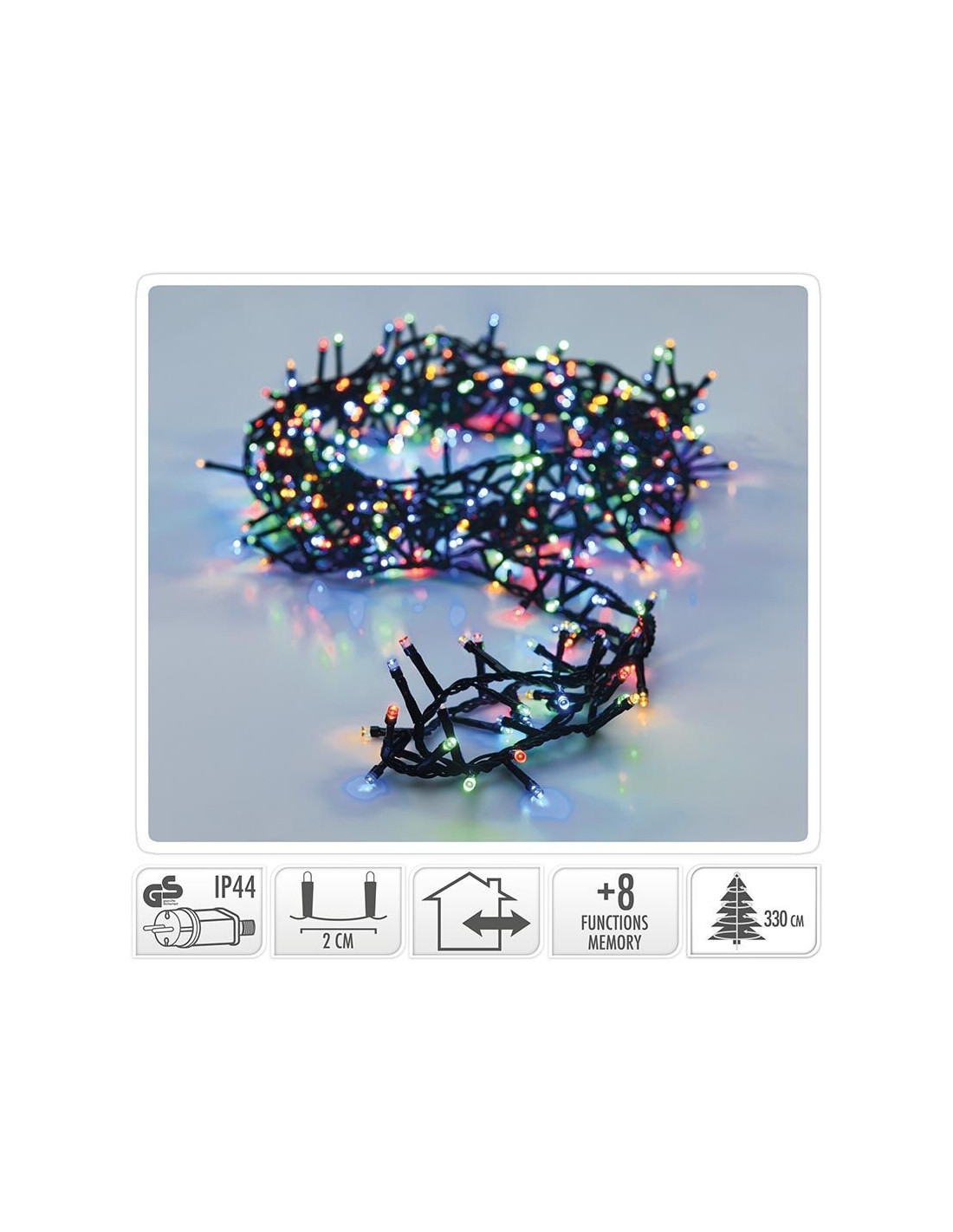 Kerstverlichting 36 meter, 1800 LED lampjes, binnen en buiten Met een lengte van 36 meter is deze clusterverlichting geschikt voor een boom van 360 cm Clustersnoeren zijn ook prima geschikt om sfeervolle lichteffecten te creëren bij een schutting, een afdakje, een meubelstuk enz. Met maar liefst 1800 energiezuinige, veelkleurige LED's (multicolor) Controller met 8 verschillende lichtfunkties en geheugen De lengte van het aansluitsnoer is 3 meter, de ruimte tussen de LED-lampjes is 2 cm De kleur van het snoer is groen De lengte van het takje (branch) is 3 cm Geschikt voor binnen en buiten (Beschermwaarde IP44) Verbruik 12W 3V, 2mA