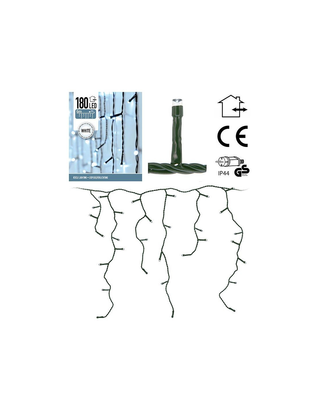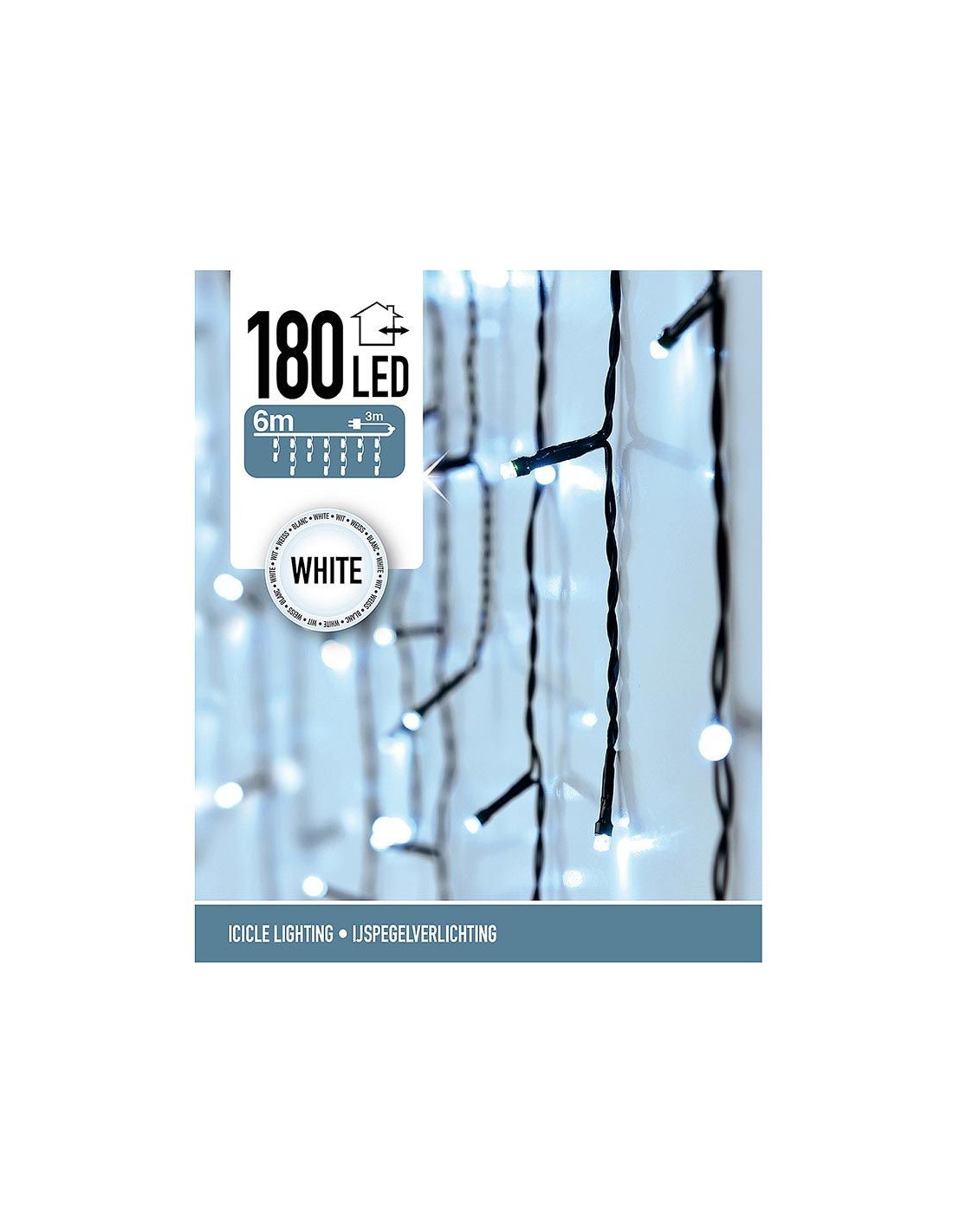 LED-IJspegel 180 lampjes LED's, 6 meter, binnen en buiten Een fraai lichtgordijn voor binnen en buiten met maar liefst 180 LED's Korte en lange strengen wisselen elkaar af zodat er een prachtig lichtgordijn ontstaat Ideaal om voor het raam of langs de muur te hangen De kleur van de LED's is wit De breedte van het lichtgordijn is 6 meter De lengte van de langste strengen is 52 cm Het aansluitsnoer is 3 meter lang Wordt geleverd met IP44 adapter, dus ook geschikt voor buiten Verbruik 3.6W 3V, 15mA