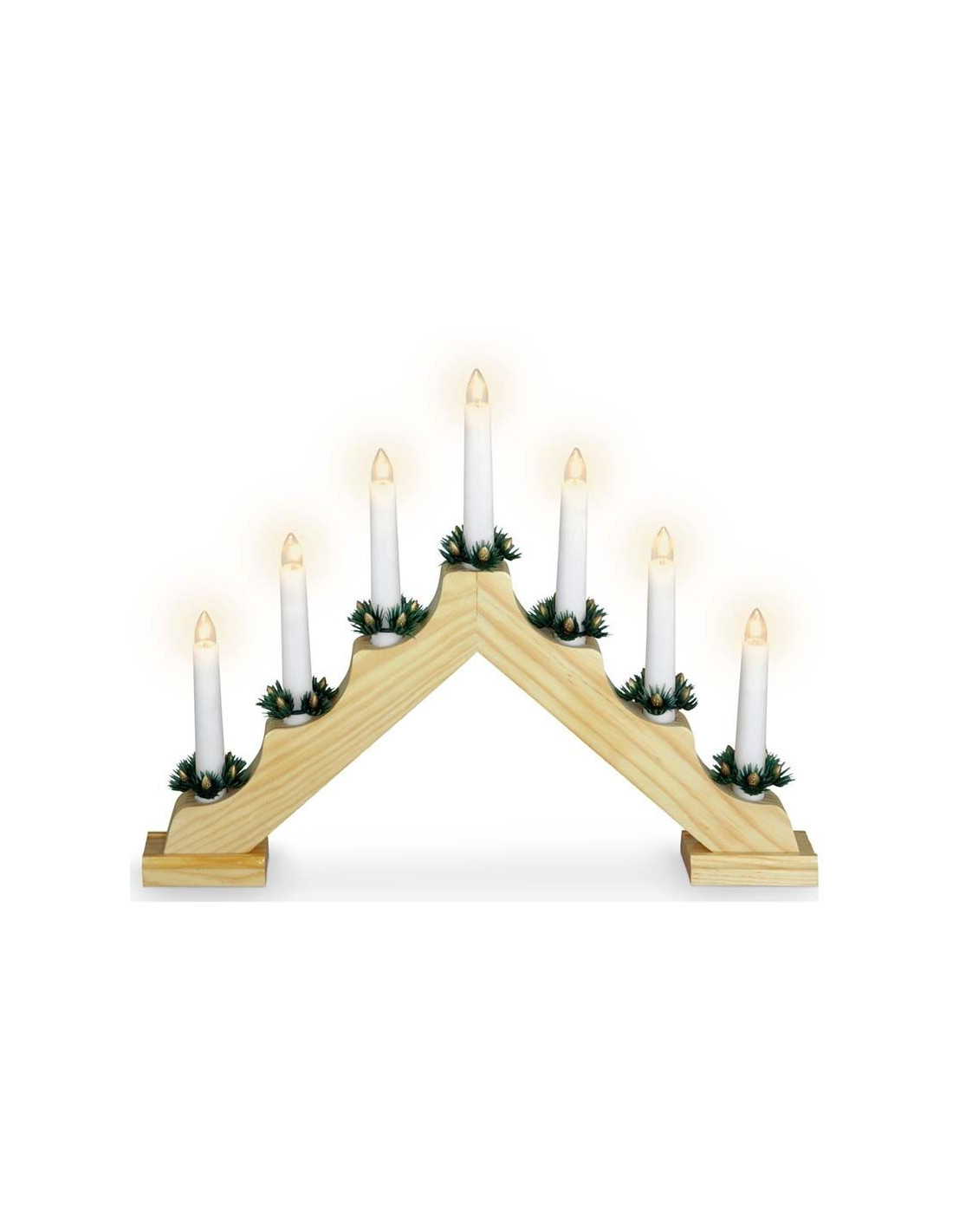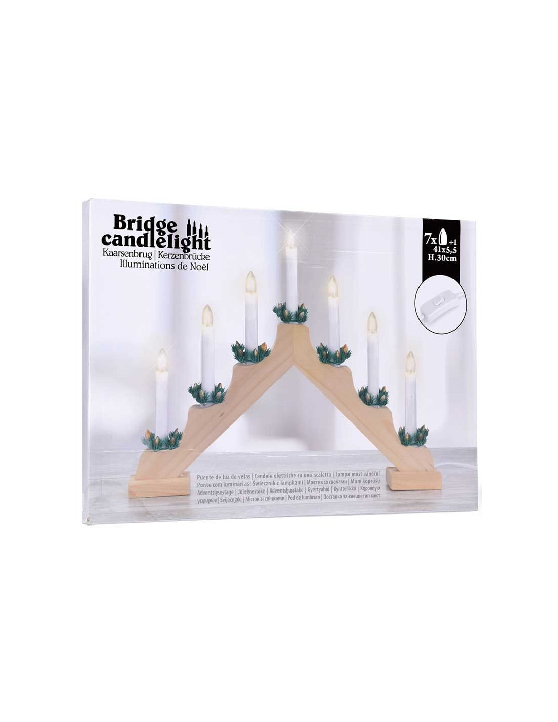 Houten kaarsenbrug met 7 witte lampjes inde vorm van kaarsen Hoogte: 30 cm Met schakelaar, de lengte van het aansluitsnoer is ca. 150 cm 220-240V, 50Hz, 21W