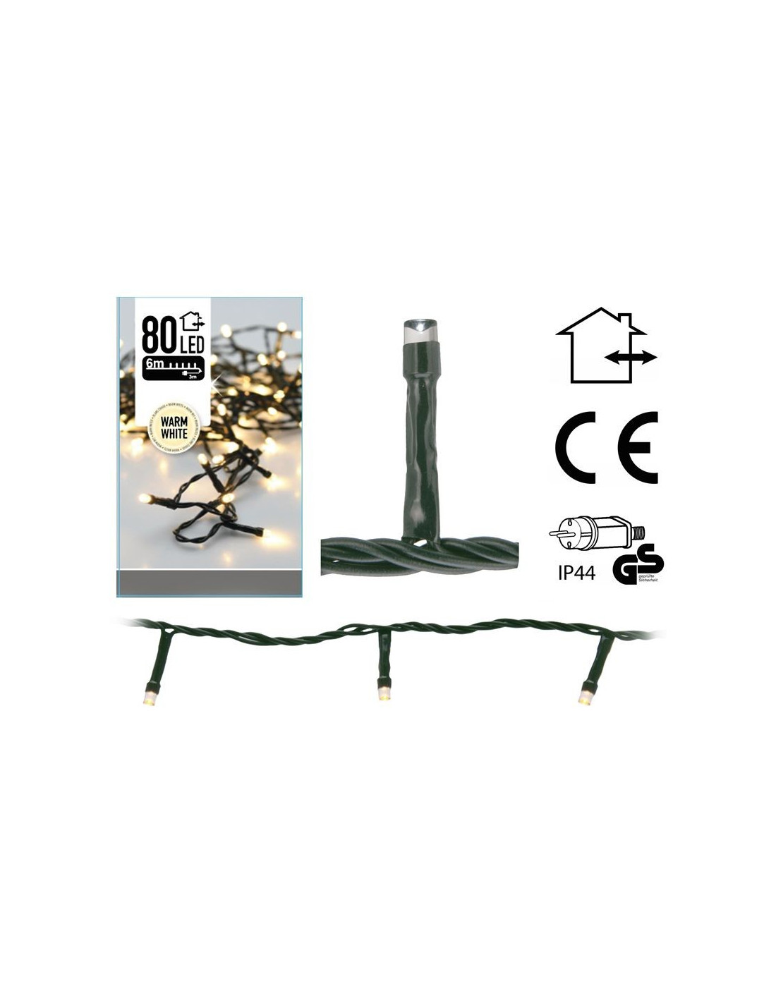 LED Lichtsnoer 6 meter, 80 lampjes, binnen en buiten Aantal LED's: 80 Afstand tussen LED's: 7.5 cm Lengte aanloopsnoer: 3 meter Lengte lichtsnoer: 6 meter Lengte totaal: 9 meter Kleur LED: warm wit Kleur snoer: groen Met adapter (beschermwaarde IP44) Geschikt voor binnen en buiten Verbruik: 1.35W 220-240V, 50-60Hz 3V, 15mA