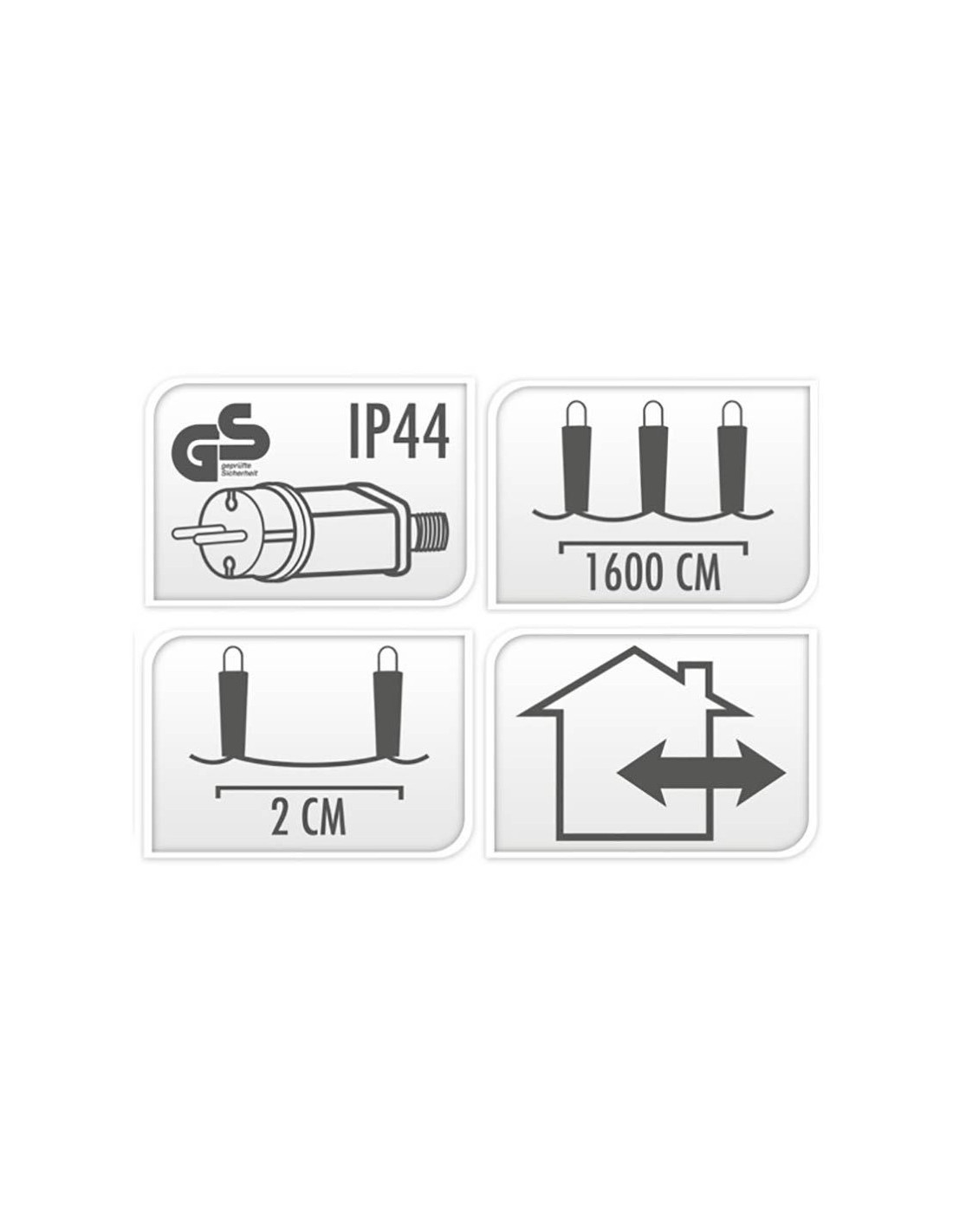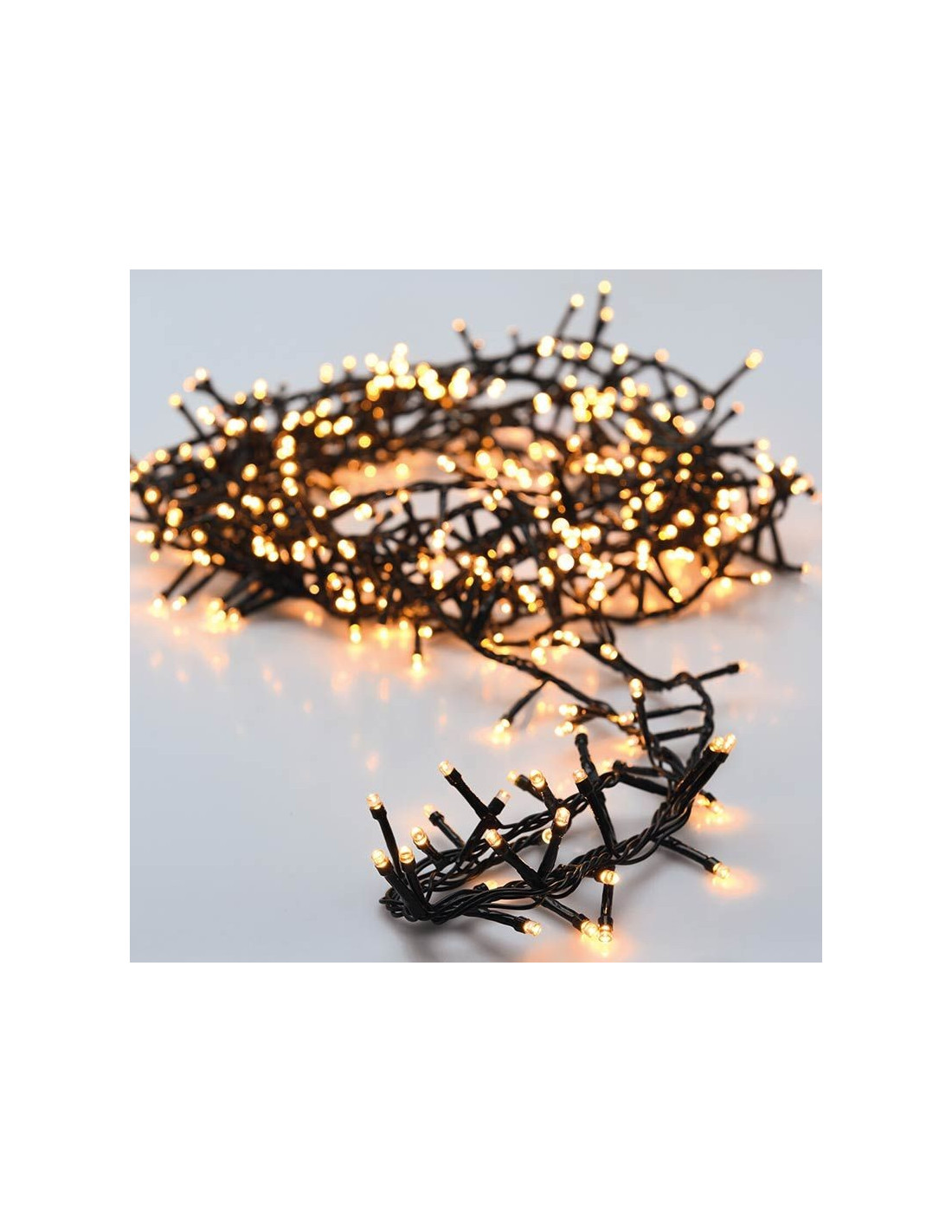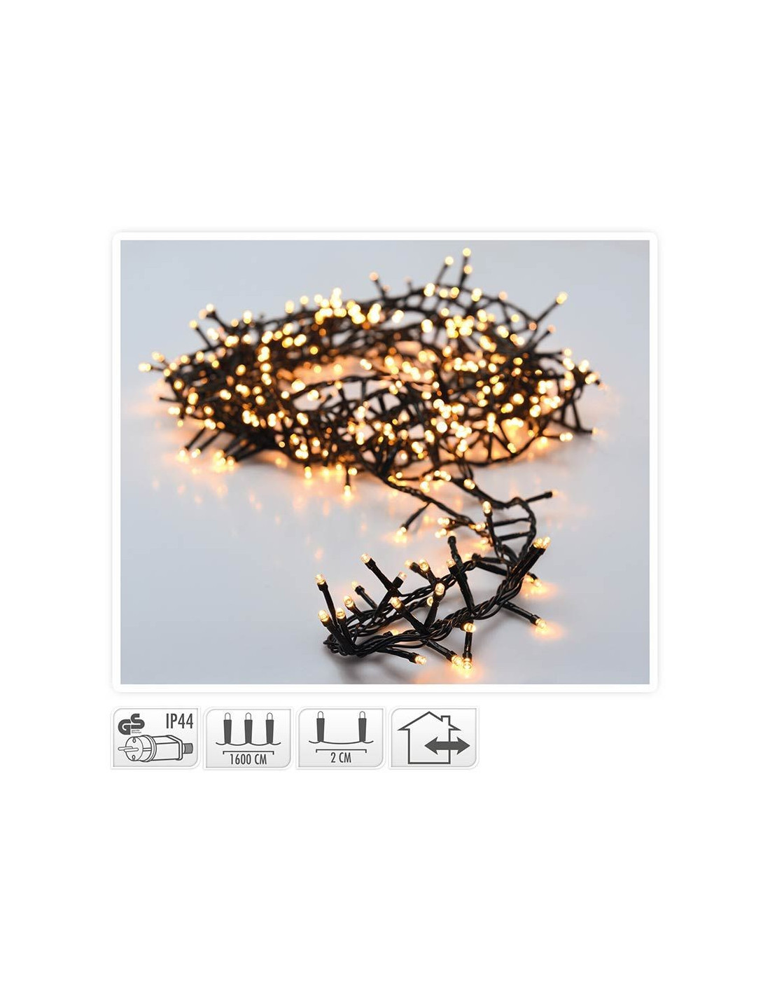 kerstverlichting, microcluster, snakelight aantal LED's: 800 kleur: warm wit lengte lichtsnoer: 16 meter lengte aanloopsnoer: 3 meter lengte takje: 3 cm afstand tussen de lampjes: 2 cm kleur snoer: groen beschermwaarde: IP44 (spatwaterdicht) geschikt voor een kerstboom van geschikt voor binnen en buiten budgetline: geen extra functies verbruik: 3.6W 3V / 2mA