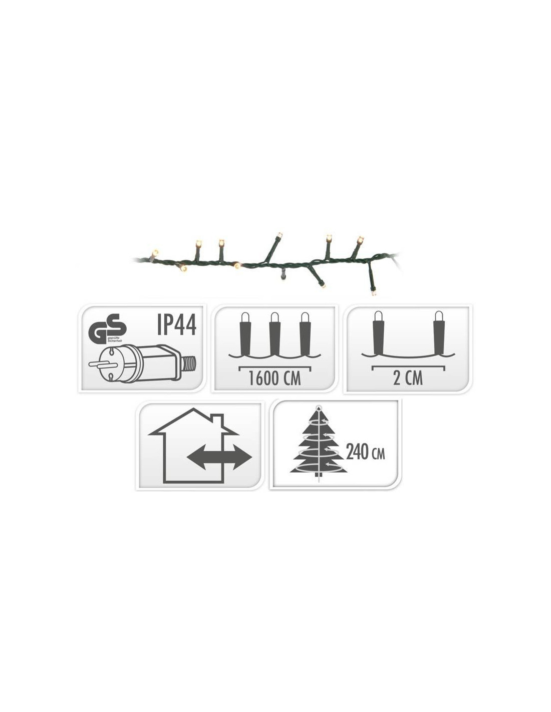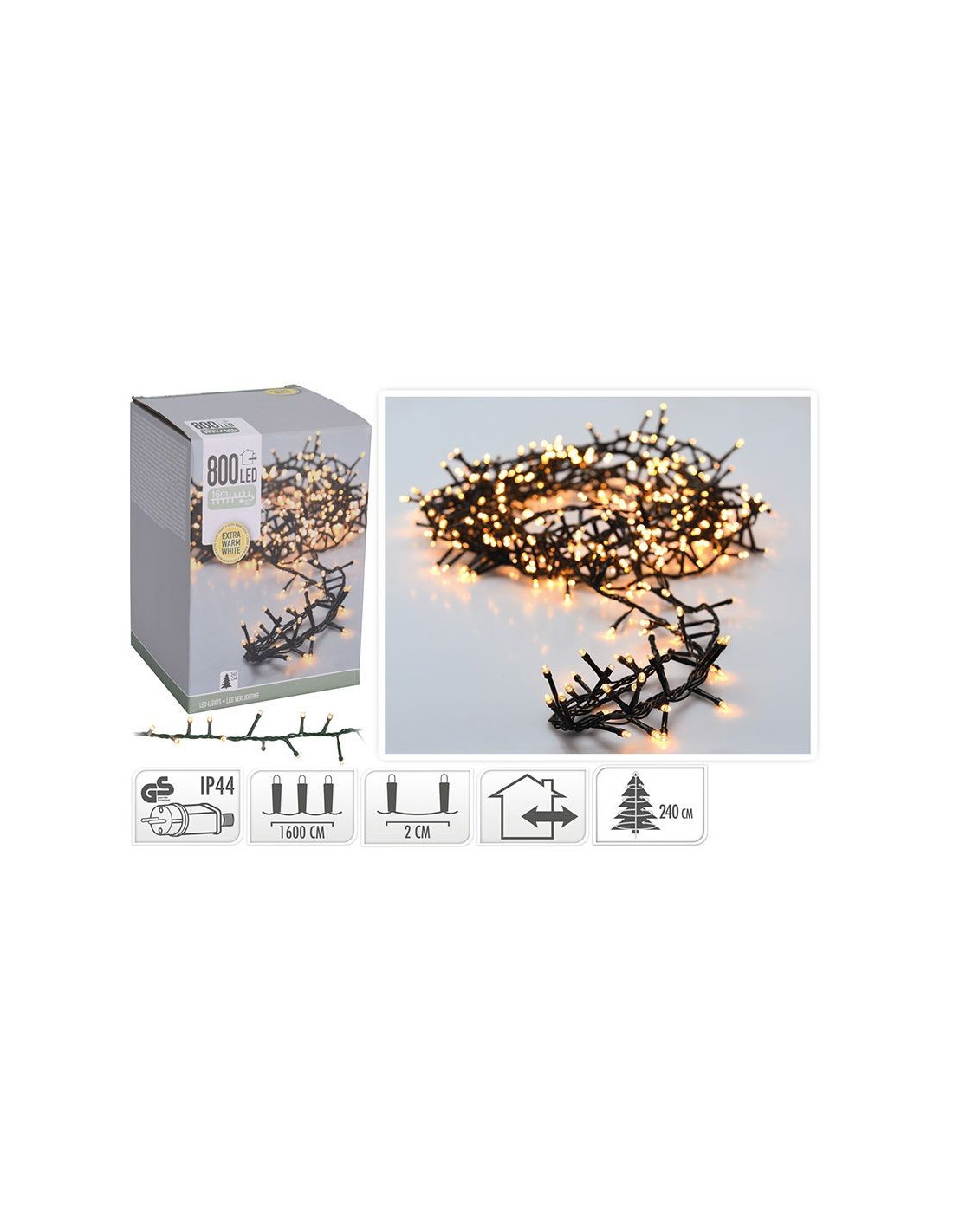 kerstverlichting, microcluster, snakelight aantal LED's: 800 kleur: extra warm wit lengte lichtsnoer: 16 meter lengte aanloopsnoer: 3 meter lengte takje: 3 cm afstand tussen de lampjes: 2 cm kleur snoer: groen beschermwaarde: IP44 (spatwaterdicht) geschikt voor een kerstboom van geschikt voor binnen en buiten budgetline: geen extra functies verbruik: 3.6W 3V / 2mA
