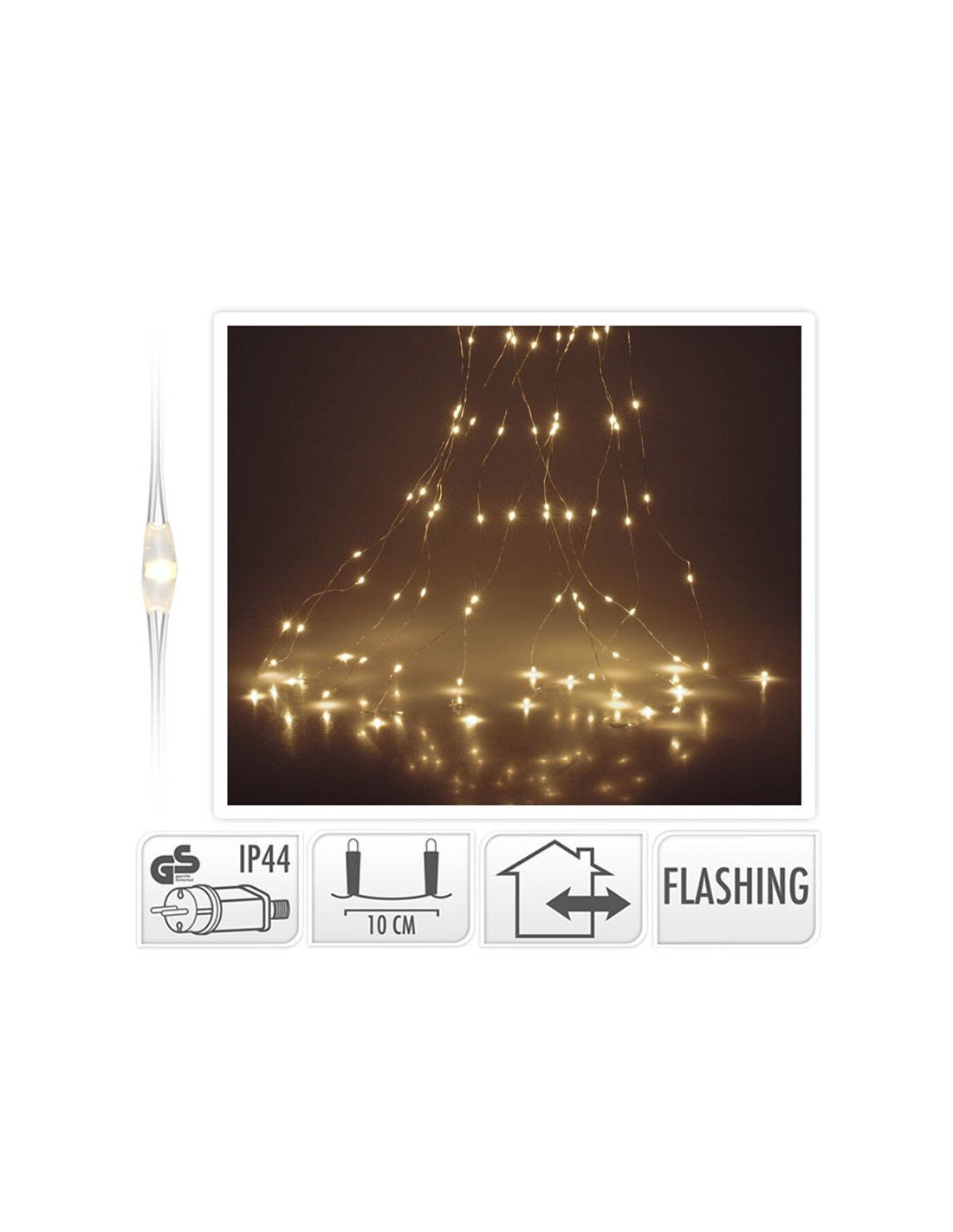cascadeverlichting is een bos van zilverdraden met led lampjes, hierdoor is het ideaal als kerstboomverlichting 10 strengen van 300 cm totaal 300 LED's, waarvan 60 flashing LED's kleur: warm wit beschermwaarde adapter: IP44 (spatwaterdicht) geschikt voor binnen en buiten lengte aanloopsnoer: 500 cm zuinig in verbruik: 2.7W