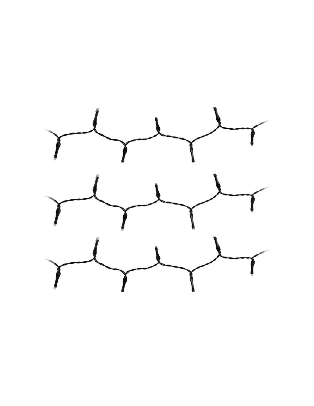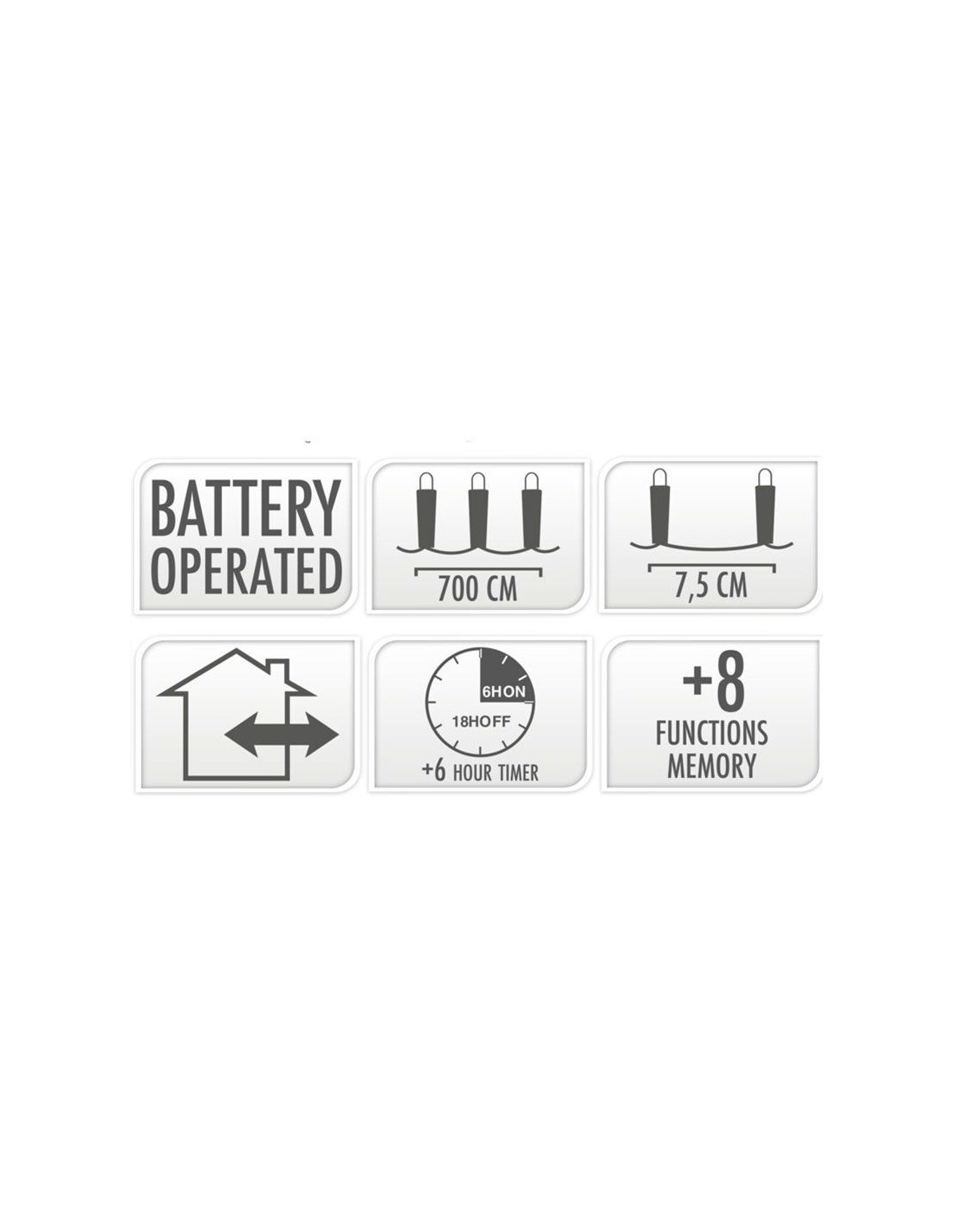 Versier je huis met deze warm witte LED lampjes, de lampjes werken op batterij en zijn dus ideaal om door het gehele huis te gebruiken. kleur LED: warm wit aantal LED’s: 96 lengte lichtsnoer: ca. 7 meter lengte aanloopsnoer: 0.5 meter afstand tussen LED's: 7,5 cm kleur snoer: zwart 8 lichtfuncties met 6-18uurs timer. Na 6 uur schakelt de verlichting automatisch uit, na 18 uur wordt de verlichting weer autmatisch ingeschakeld werkt op 3x AA batterijen (niet meegeleverd) beschermwaarde IP44 geschikt voor binnen en buiten