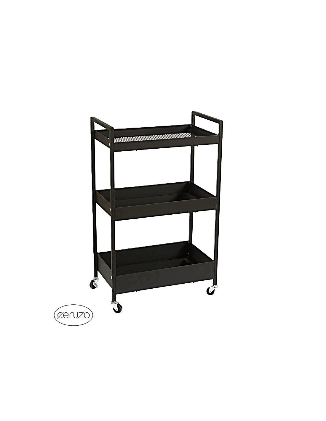 ideaal voor keuken, woonkamer, slaapkamer of badkamer metalen frame totale afmeting: 51 x 30 x 82.5 cm aantal lagen / manden: 3 afmeting manden: 48 x 30 cm hoogtes manden: 9, 6 en 4 cm de bovenste mand heeft een mesh-onderzijde (luchtdoorlatend) 4 zwenkwielen, waarvan 2 met rem kleur: zwart montagetijd: 10 - 15 minuten merk: Ceruzo