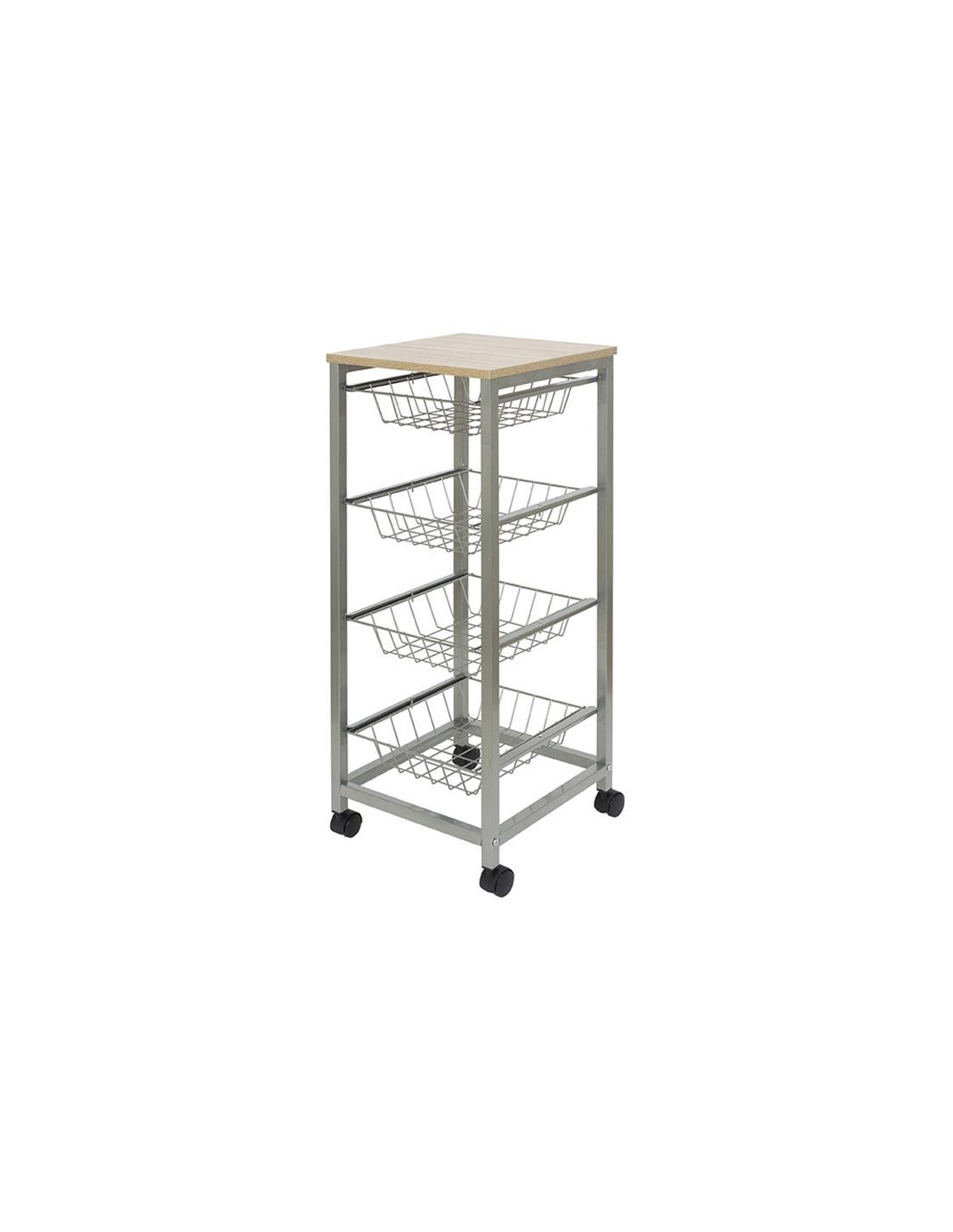 Wil je iets opbergen in je keuken, maar zitten de kastjes allemaal vol? Deze verrijdbare trolley is de oplossing. De 4 uitschuifbare metalen lades bieden ruimte voor het opbergen van diverse spullen, zoals handdoeken en theedoeken, kruidenpotjes of groente en fruit. Het houten werkblad biedt ruimte om de trolley als werkruimte te gebruiken, maar kan ook gebruikt worden als extra ruimte om spullen neer te zetten. De trolley staat erg stijlvol in de keuken, maar kan ook een praktische oplossing bieden in andere kamers, zoals de badkamer. Tevens is de trolley te gebruiken als serveerwagen. afmetingen: circa 33,5 x 36 x 87,5 cm (l x b x h) materiaal: metaal en hout met 4 zwenkwielen, makkelijk te verplaatsen houten werkblad 4 uitneembare metalen manden tevens te gebruiken als serveerwagen ook geschikt voor andere kamers eenvoudig te monteren