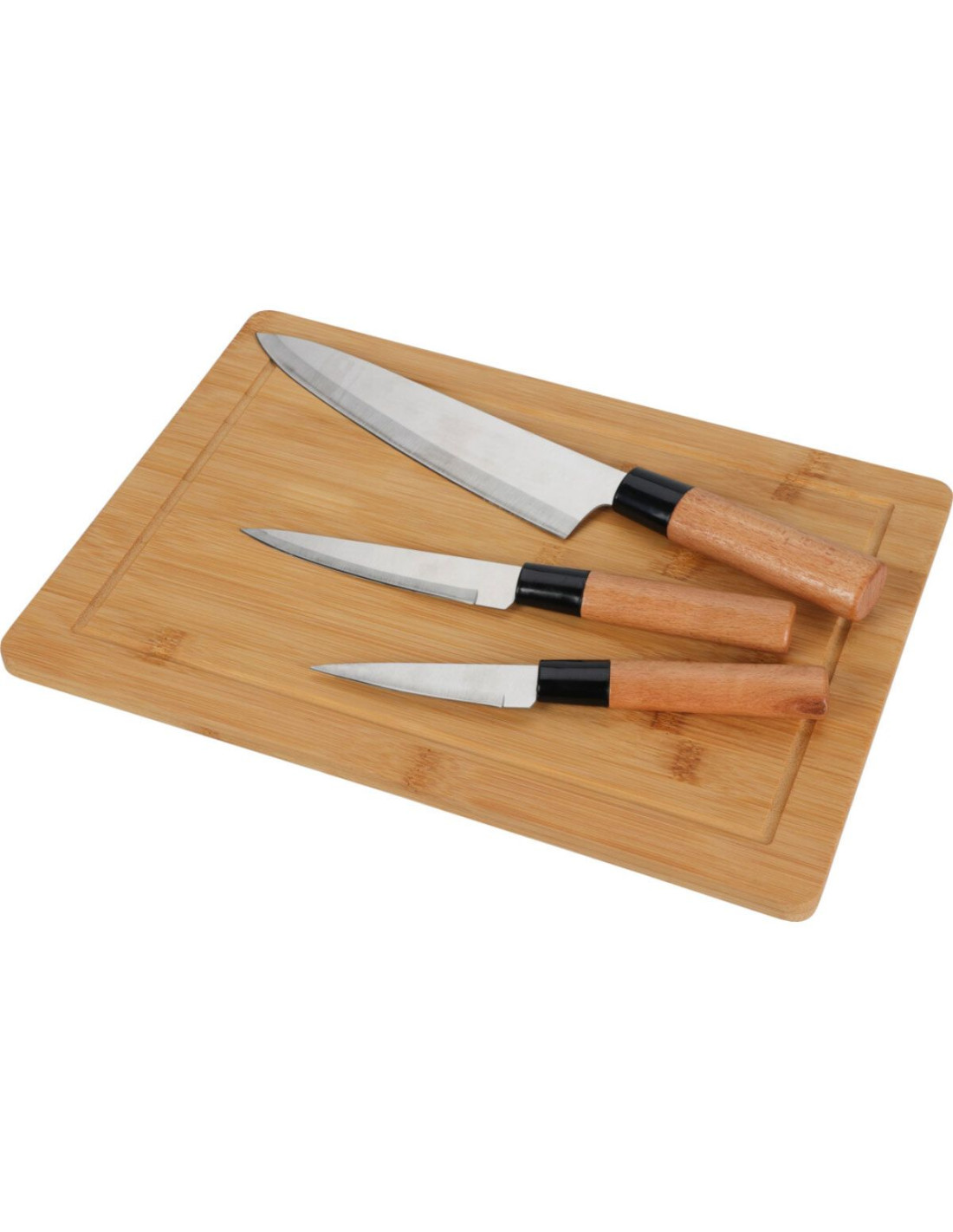 Deze 4-delige keukenset is de perfecte aanvulling voor elke kookliefhebber. Met een robuuste bamboe snijplank en drie essentiële keukenmessen, biedt deze set een combinatie van duurzaamheid en stijl. De afmetingen van de bamboe snijplank zijn 35 x 25 x 1,5 cm, ruim genoeg voor al uw snijbehoeften.