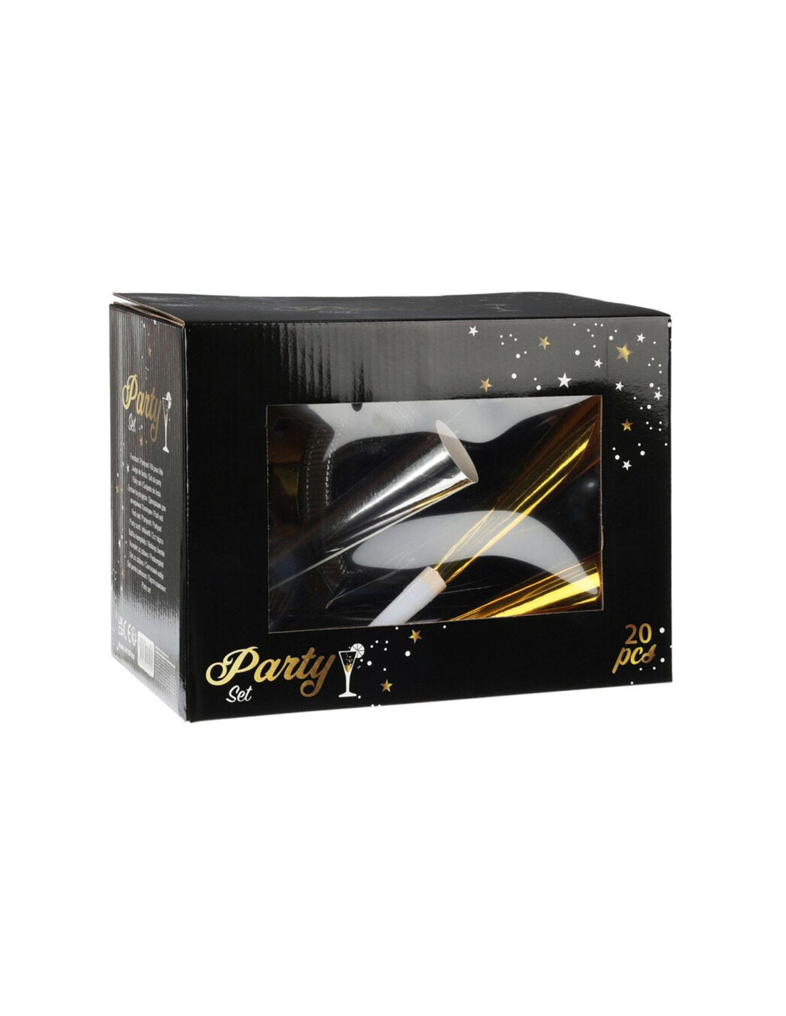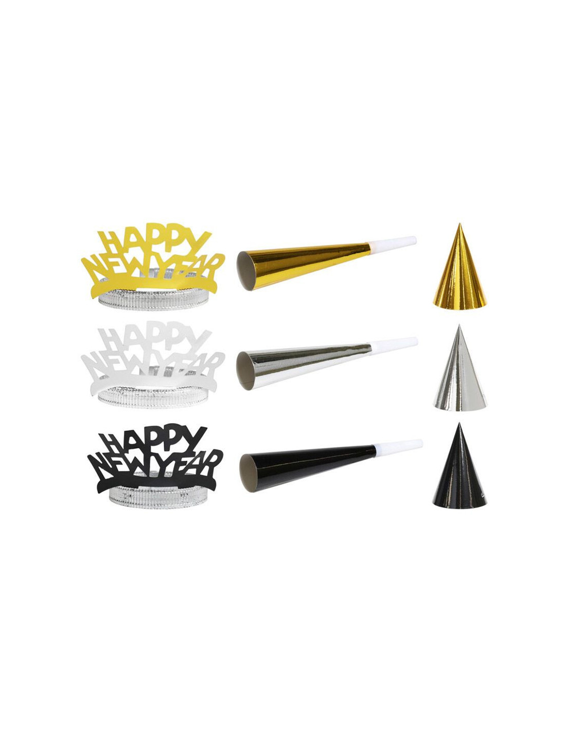 5 "Happy New Year" tiaras 5 feesthoedjes in goud, zwart en zilver 10 feesttoeters in goud, zwart en zilver