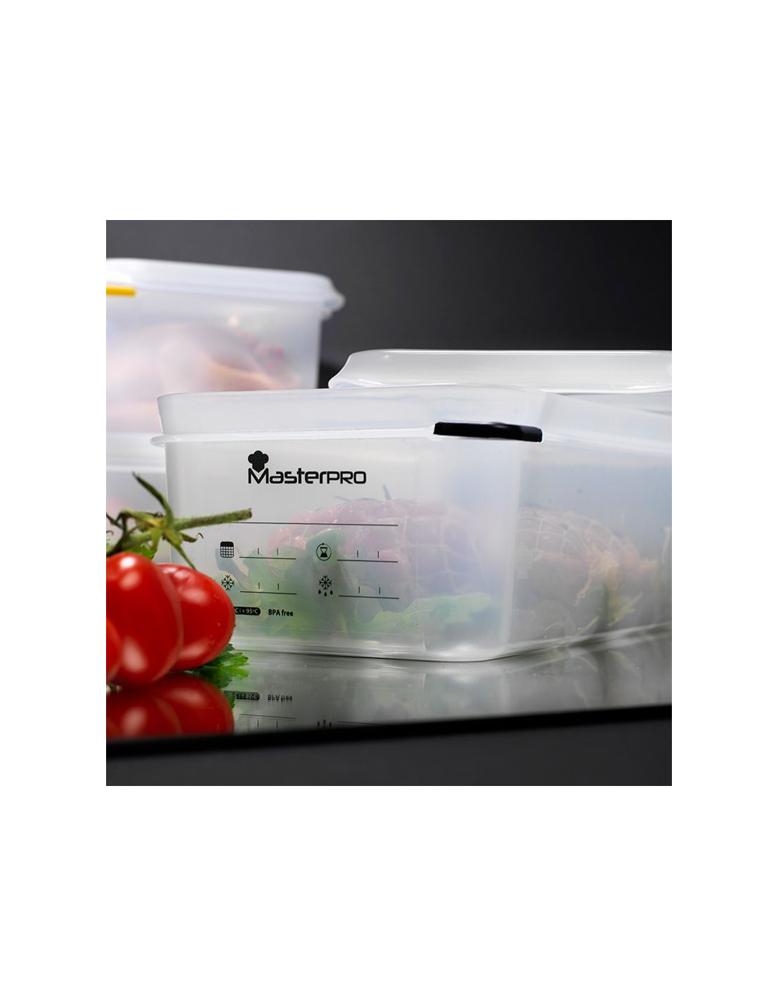 geschikt voor invriezen, bewaren en opwarmen van levensmiddelen gemakkelijk te openen transparante vershouddoos met deksel afmeting: 32.5 x 17.6 x 10 cm inhoud: 4000 ml = 4 liter geschikt vooor de magnetron bestand tegen temperaturen tussen -40 graden en +95 graden vaatwasmachine geschikt materiaal: polypropyleen BPA vrij serielijn: Masterpro Foodies Collection Bergner Masterpro BGEU-2945
