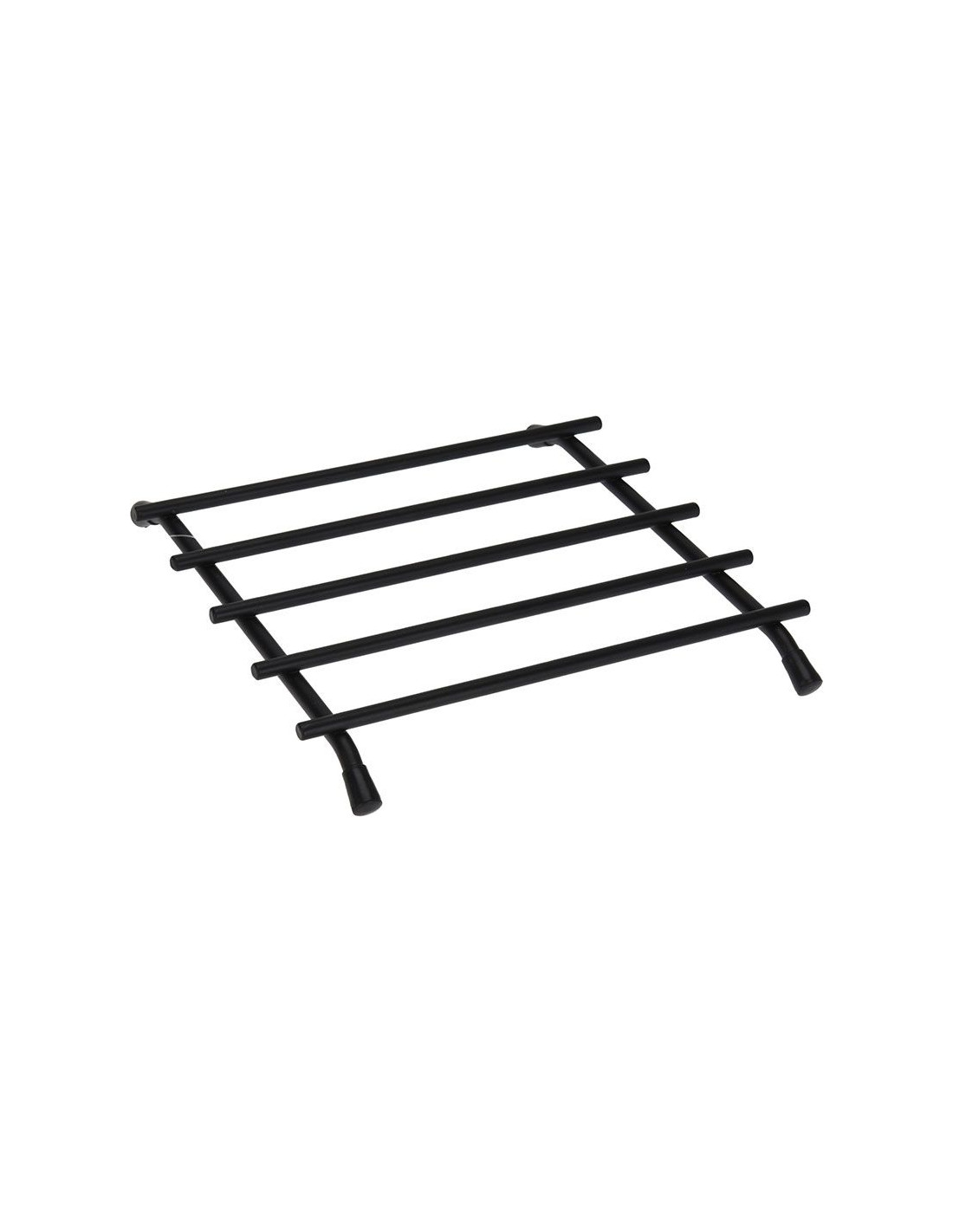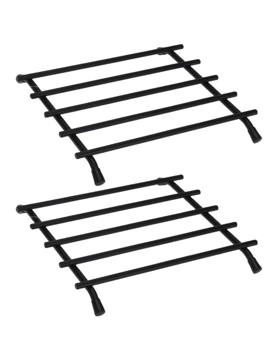 set van 2 stalen pannenonderzetters vierkant 20 cm staat ca. 1 cm boven de tafel met beschermpootjes tegen krassen