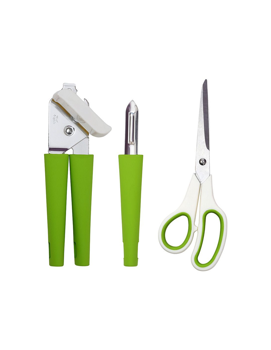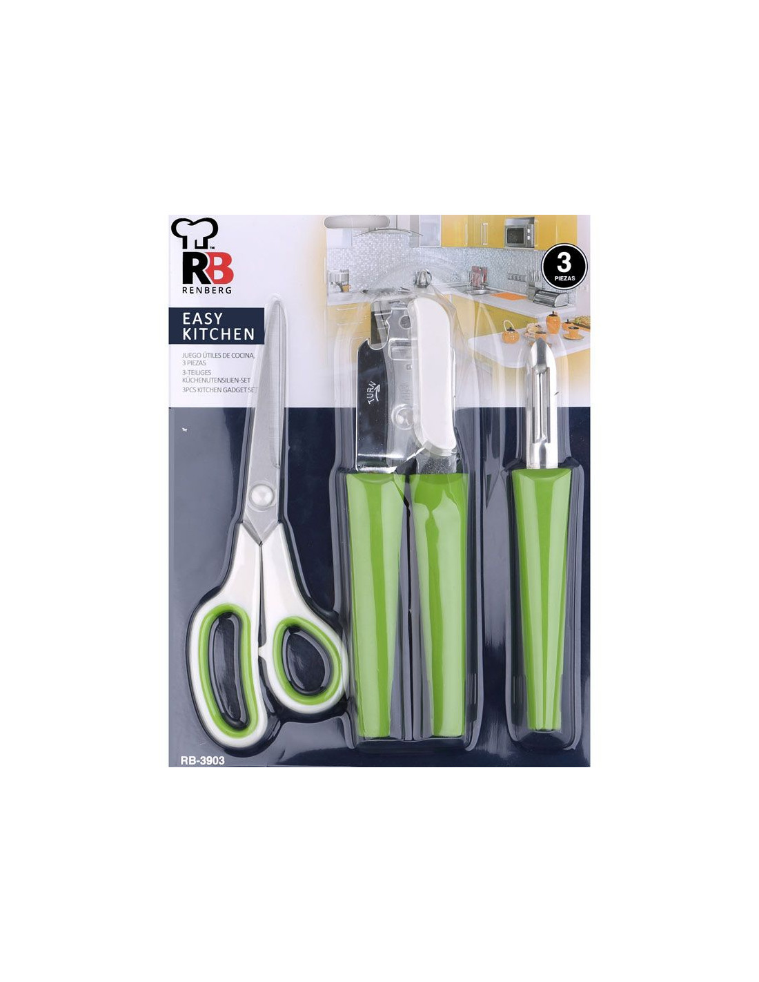 Deze 3-delige set bestaat uit: Schaar 21cm / blikopener 20.5cm / dunschiller 19cm Met "Soft-touch" handgrepen. Materiaal: RVS/kunststof