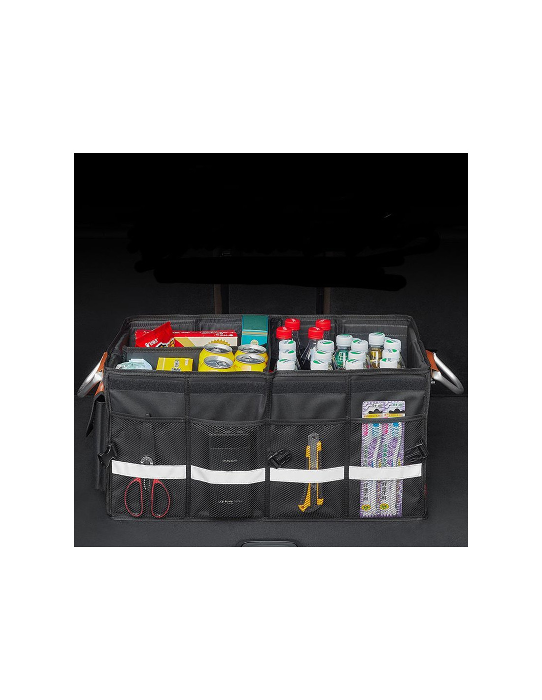 3 uitneembare tussenschotten het afneembare deksel is vast te zetten met klittenband 4 mesh voorvakken en 1 groot zijvak aluminium handgrepen opvouwbaar, door de clipsluiting plat op te vouwen reflecterende strips aan de voorzijde materiaal: Oxford 600D afmeting: 45 x 30 x H30 cm inhoud: 40 liter belastbaarheid: 15 kg kleur: zwart gewicht: 1550 gram merk: Ceruzo