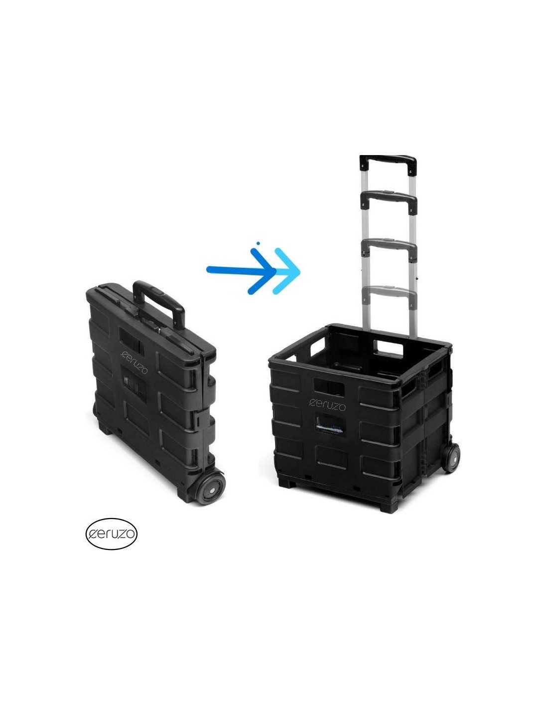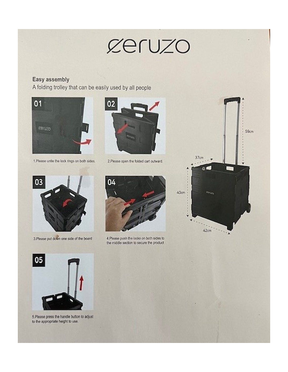 afmeting ingeklapt: 45 x 46 x 9.5 cm (incl. handvat) afmeting uitgeklapt: 38 x 42 x 98 cm (incl. handvat) afmeting kunststof krat: 38 x 40 x 42 cm (excl. handvat) inhoud: 50 liter belastbaarheid: max 25 kg. kleur: zwart gewicht: 2.7 kg uitschuifbare trekstang met 2 vergrendelingsclips en 2 verstevigingsschuiven inclusief 2 kunststof wielen inklapbaar / opvouwbaar merk: Ceruzo