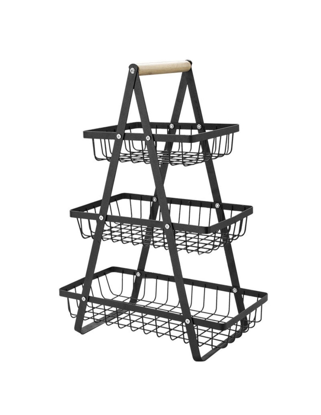 fruitmand, etagere 3 manden: 32.5 x 18, 27 x 18 en 21 x 18 cm hoogte: 47 cm materiaal: metaal en hout kleur: zwart montagetijd: 5 minuten merk: Ceruzo