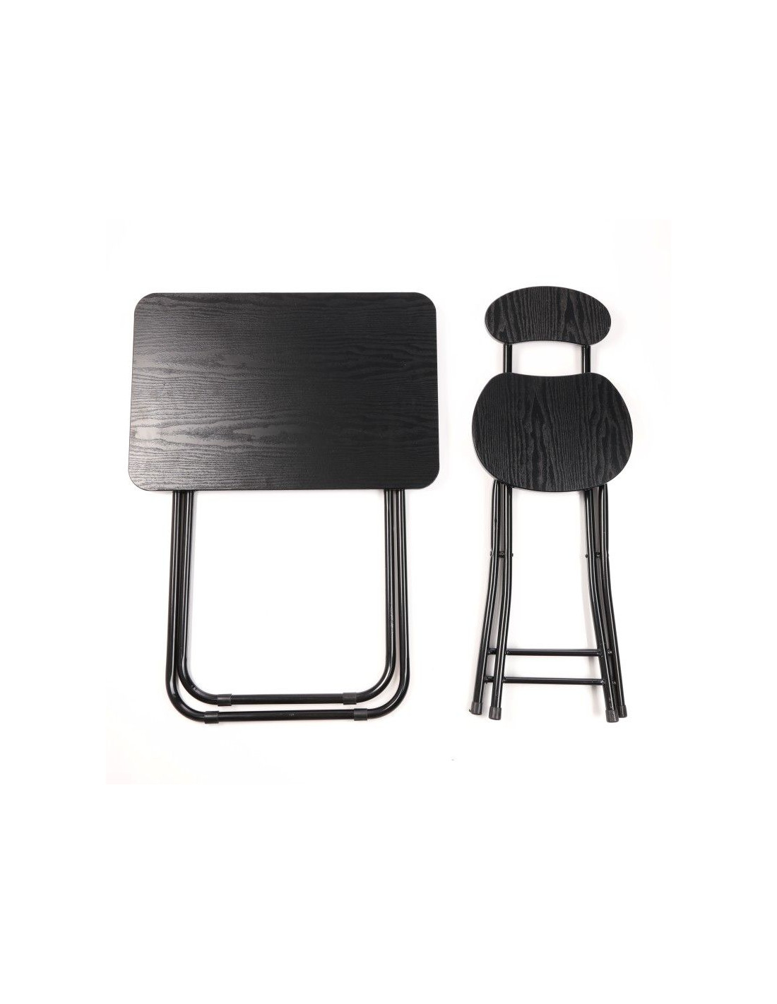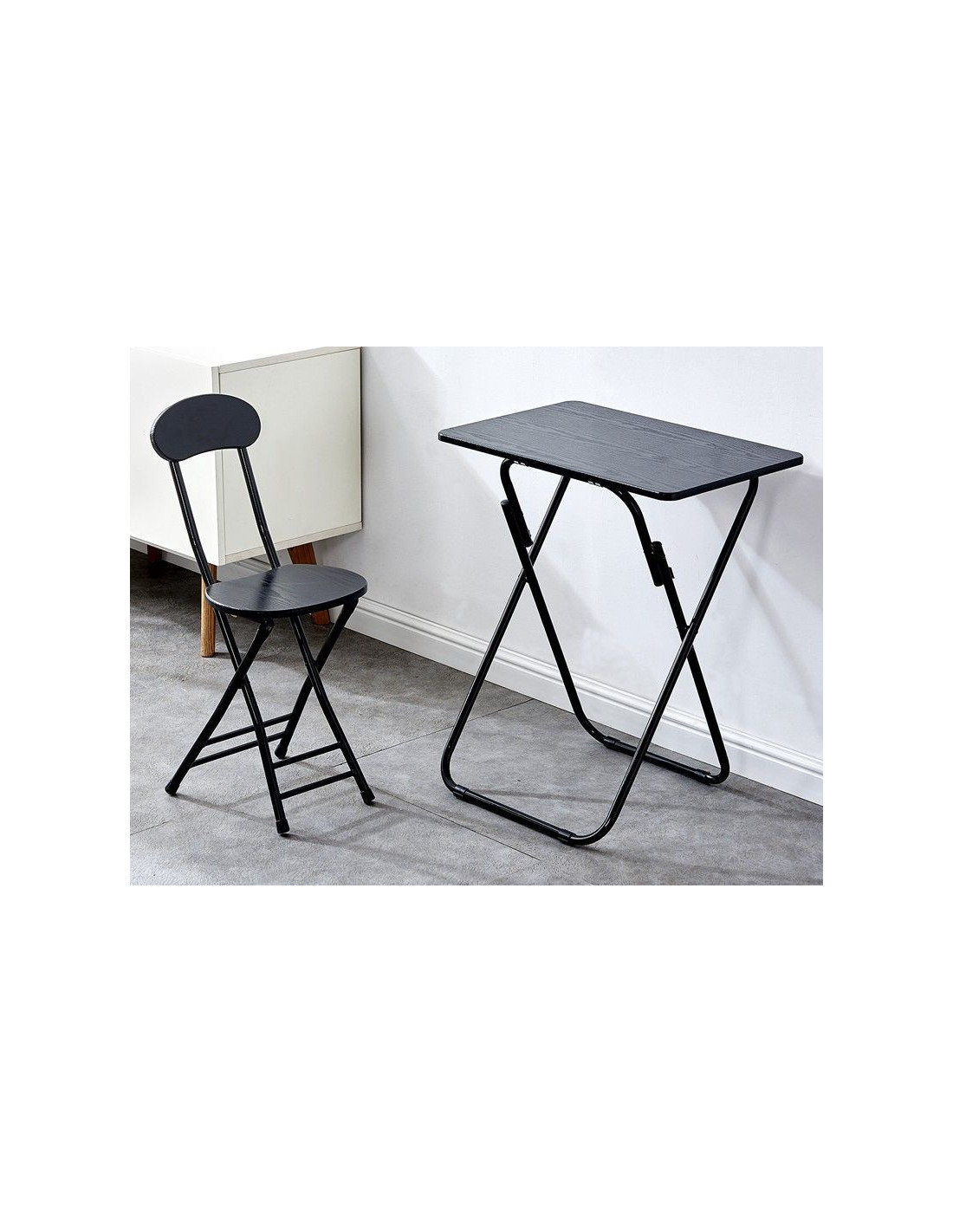 leuk voor de kinderkamer of als eenvoudig dining setje vouwbaar, zowel de tafel als de stoel zijn opklapbaar afmeting tafelblad: ca. 40 cx 60 cm hoogte tafel: 71 cm hoogte stoel: 76 cm zithoogte: 45 cm (laag model) materiaal: MDF met metaal kleur metalen frame: zwart kleur MDF tafelblad: zwart, houtmotief kleur MDF stoelzitting en leuning: zwart, houtmotief geen montage nodig, direct te gebruiken gewicht van de set: 6 kg merk: Ceruzo