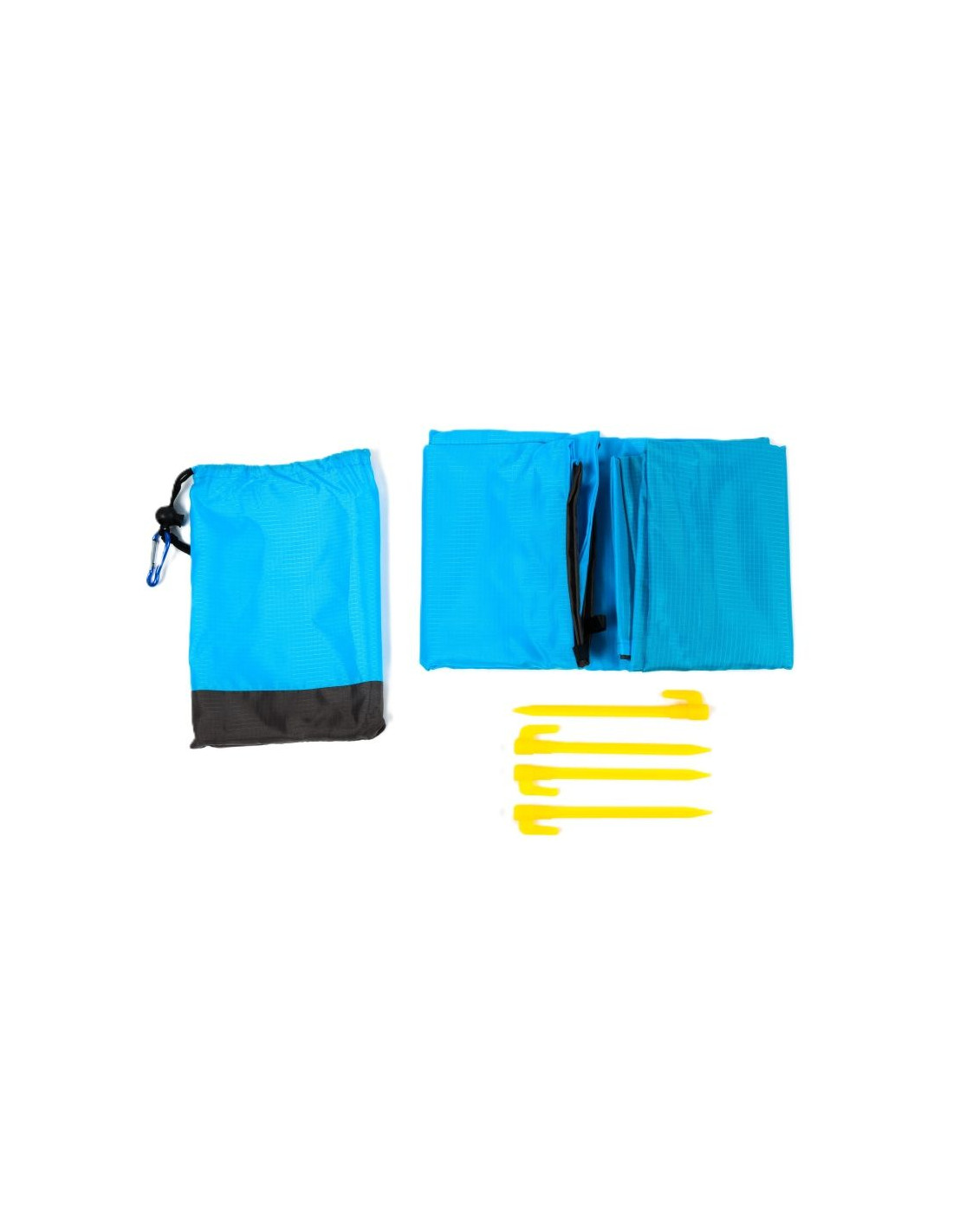 210 x 200 cm waterafstotend opbergzakje met karabijnhaak incl. 4 haringen polyester fibre lichtgewicht: 320 gram kleur: blauw met grijs merk: Ceruzo