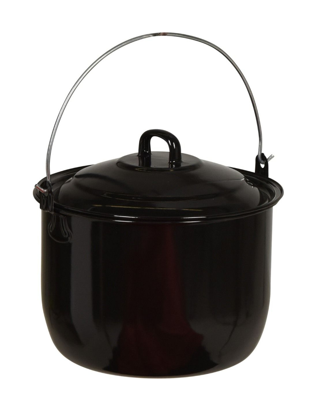 geschikt voor o.a. barbecue en openvuur met hengsel materiaal: enamel, carbonsteel diameter: 24 cm inhoud: 6.7 liter gewicht pan: 850 gram gewicht deksel: 275 gram