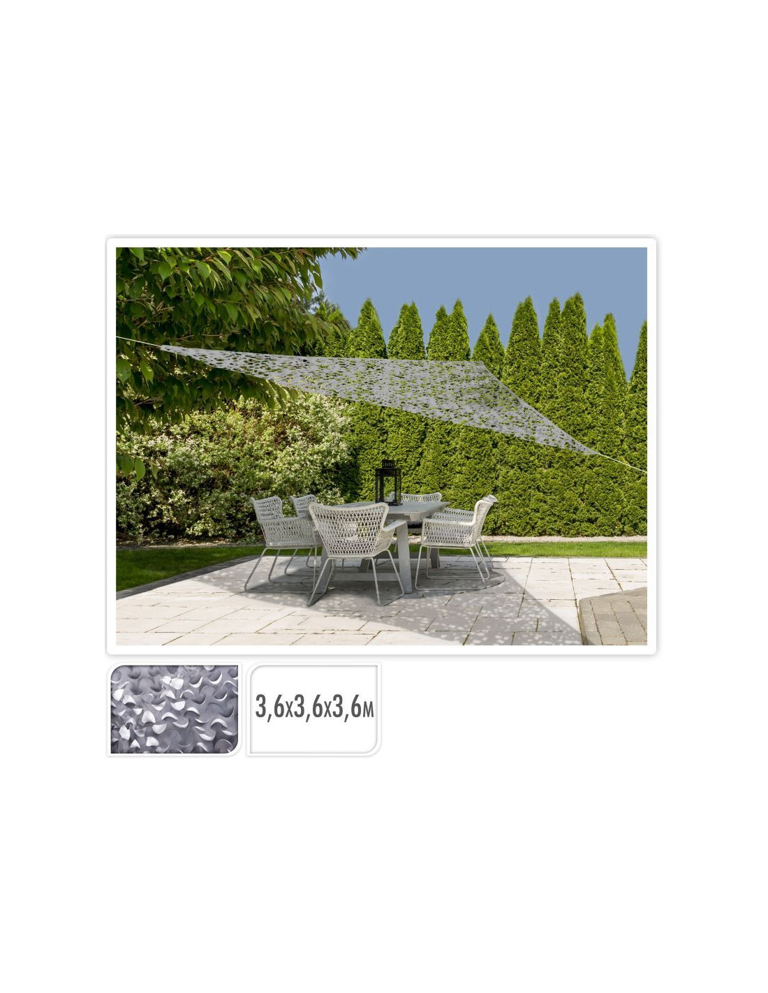 Bescherm jezelf tegen direct zonlicht met dit schaduwdoek. Het onderscheidende aan dit camouflagedoek is dat het door de speciale gaten wind doorlaat. Hierdoor is dit zonnezeil ook waterdoorlatend en dus beter bestemd tegen stormachtig weer dan een standaard schaduwdoek. Makkelijk te bevestigen met de meegeleverde scheerlijnenset. afmeting: 360 x 360 x 360 cm vorm: driehoek kleur: (licht) grijs, (de kleur kan iets afwijken van de afbeelding) compleet met 3x 3.50 meter touw materiaal: 210D polyester verpakt in een afsluitbare draagzak