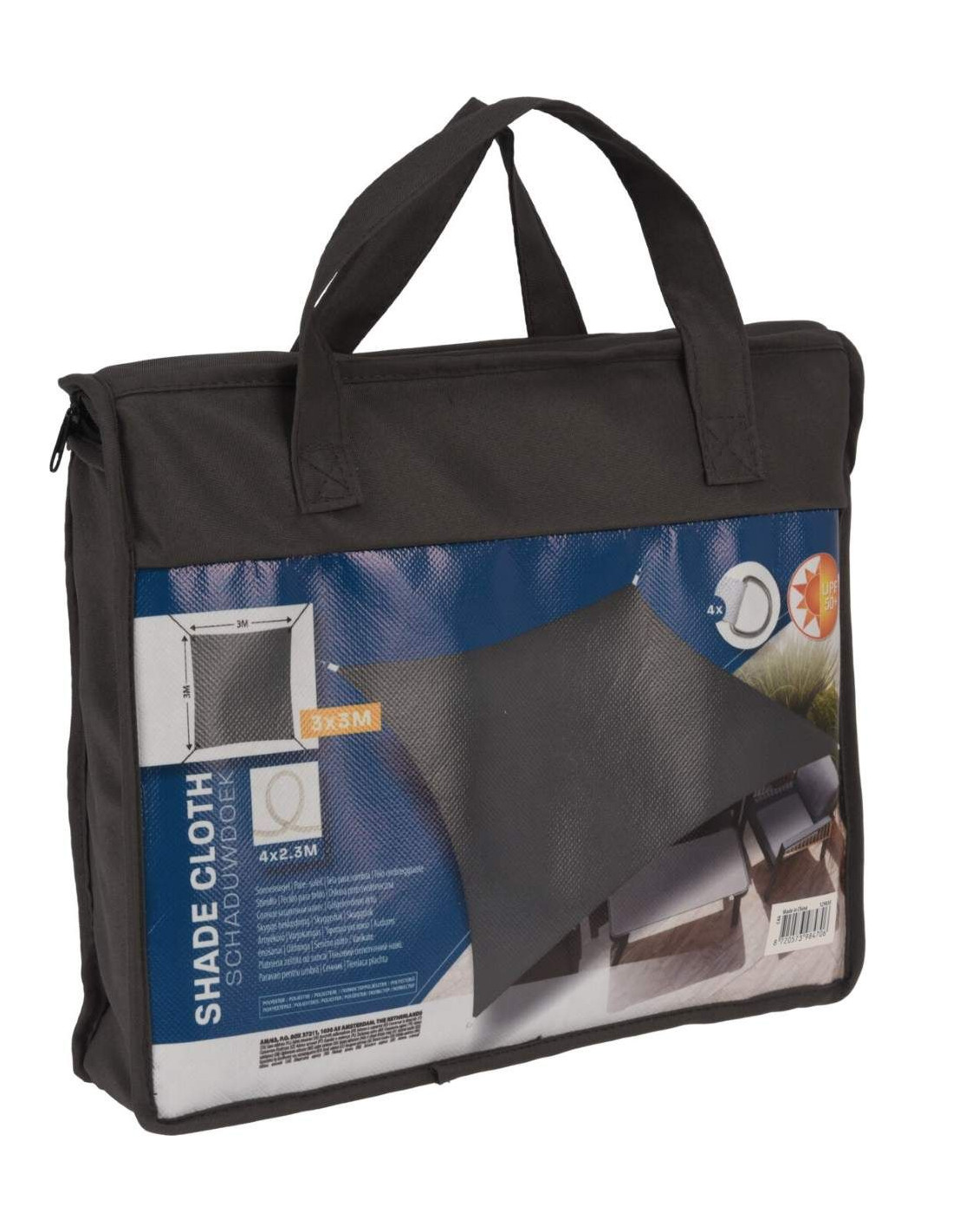 polyester vierkant 300 x 300 170 gram/m2 grijs waterafstotende coating UPF 50+ 4 metalen hoekhaken 4x touw lengte 230 cm opbergtas