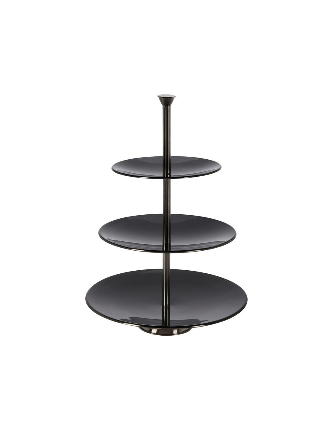 Stijlvolle zwarte etagere van RVS om je bonbons en koekjes op te presenteren aan je gasten, ook erg leuk voor een high tea. De etagere heeft 3 plateaus, waardoor je er diverse hapjes op kan plaatsen. 3 plateaus: Ø25, 20,5 en 16 cm gemaakt van roestvrij staal glanzend 36,5 cm hoog gewicht: 580 gram