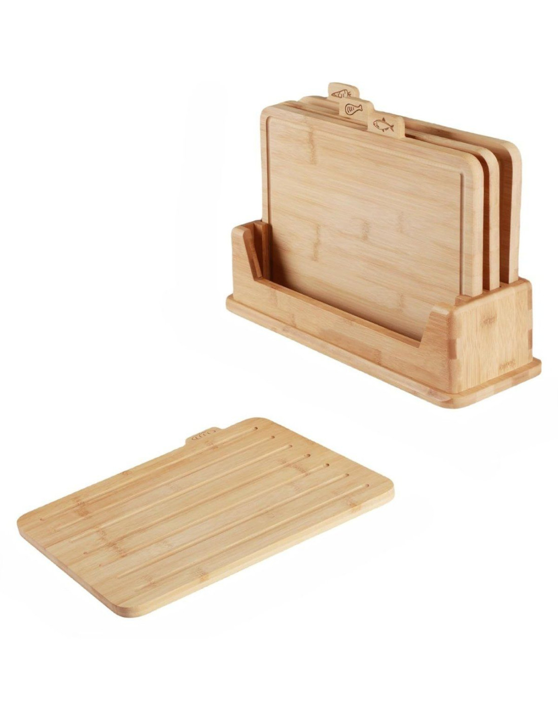 materiaal: bamboe 4 snijplanken voor fruit en groente, vlees, vis en brood de brood snijplank heeft extra inkepingen om de broodkruimels op te vangen handige standaard voor het compact en overzichtelijk opbergen van de snijplanken afmeting snijplank: 32 x 23 cm dikte snijplank: 1 cm afmeting standaard: 36 x 12 x H26 cm zware kwaliteit, gewicht: 2730 gram merk: Ceruzo