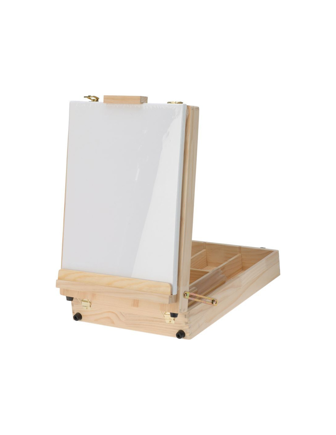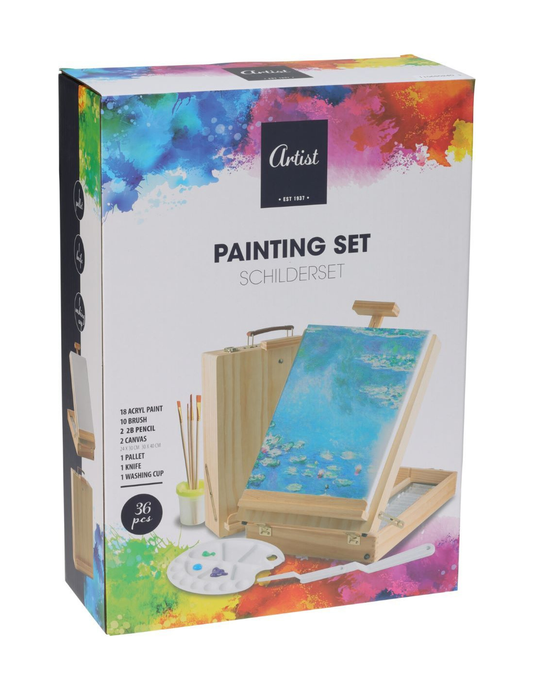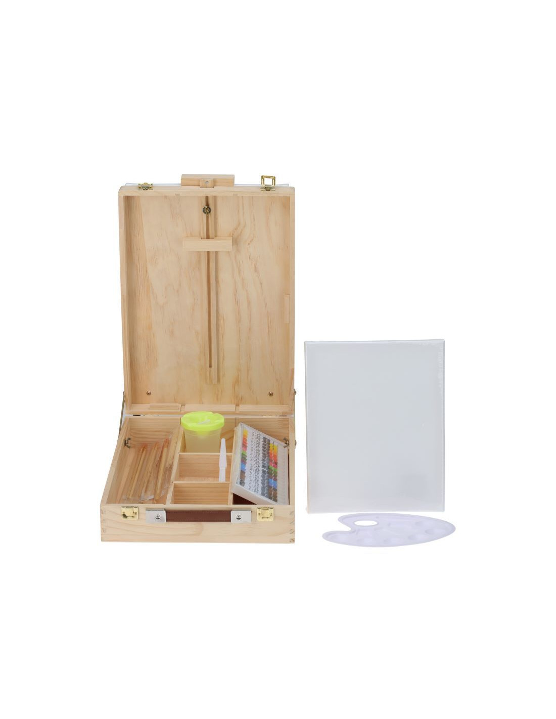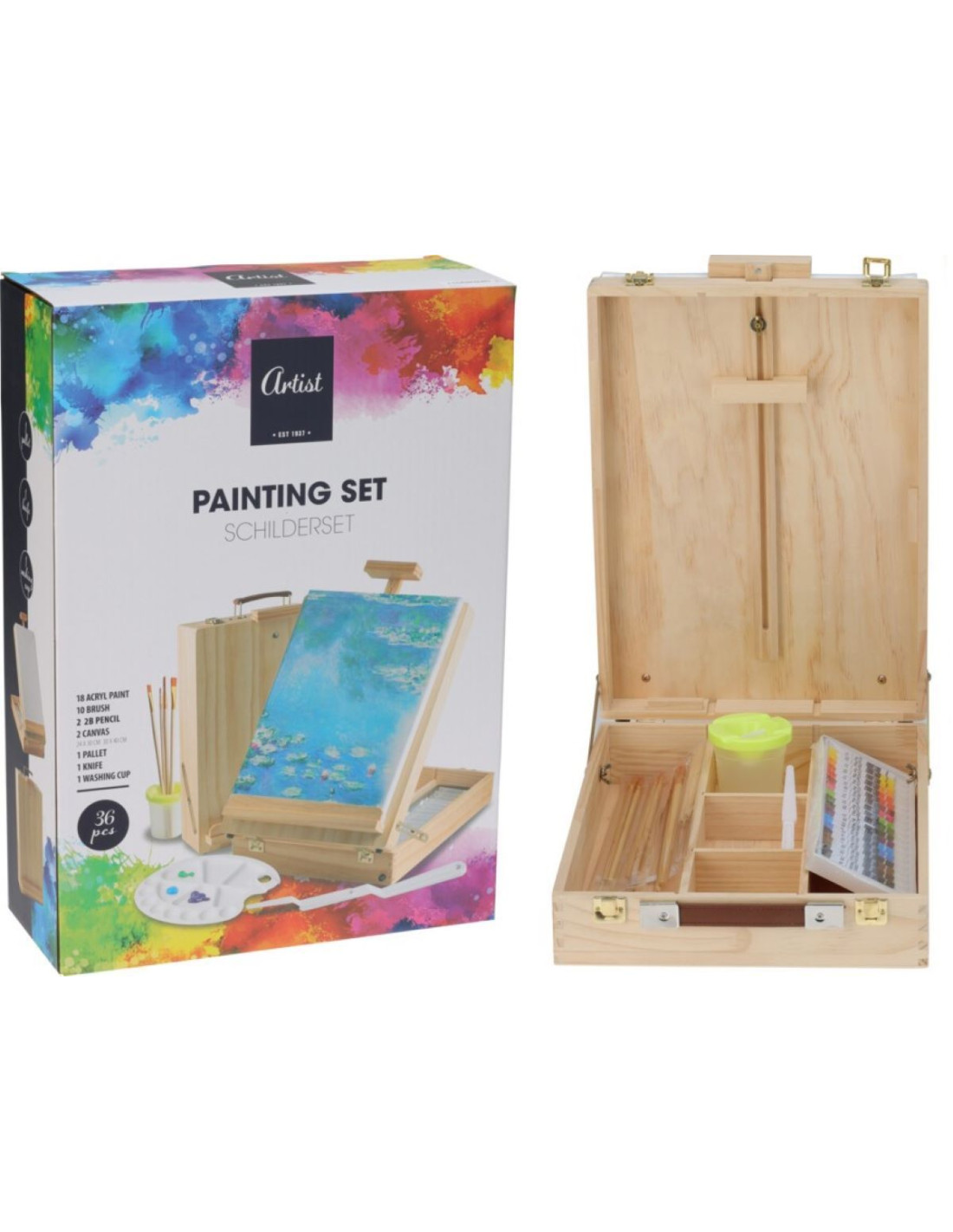 stevige tafelezel eenvoudig in hoogte te verstellen, voor canvasdoeken tot 70 cm de tekenkist is gemaakt van duurzaam dennenhout, voorzien van het FSC keurmerk geschikt voor kinderen en volwassenen al je schildersartikelen netjes en georgansieerd opgeborgen afmeting houten koffer: ca. 45 x 32 x 13 cm eenvoudig verstelbare hoek tot max 90 graden inhoud: 1x canvasdoek 24 x 30 cm 1x canvasdoek 30 x 40 cm 18x tube acrijlverf 12ml 10x penselen (5 maten) 2x 2B potloden 1x verfpallet 1x mengstaaf 1x waskopje