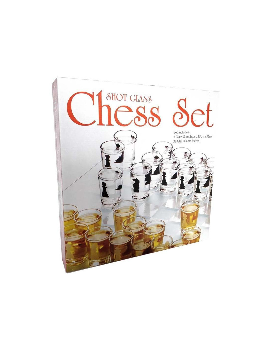 Glazen schaakbord van 35 x 35 cm 32 Shotglaasjes met afbeelding