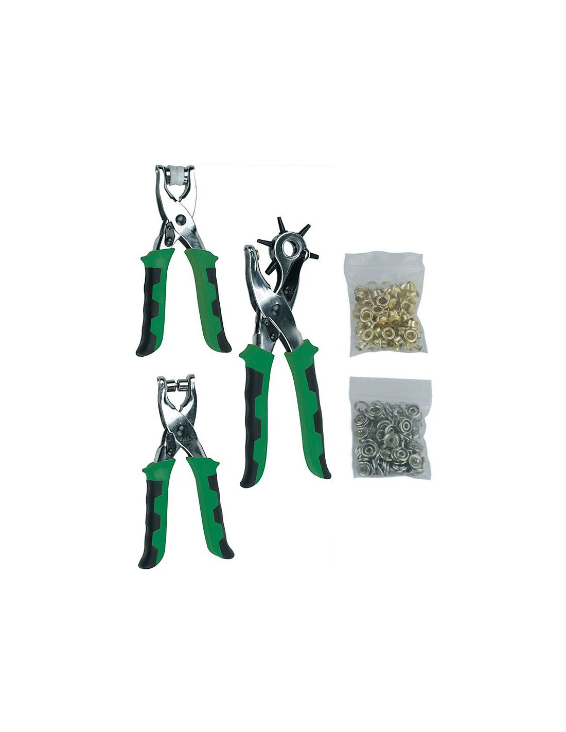 - Revolver-, oog- en drukknooptangenset, 3-delig met assortiment ogen en drukknopen.