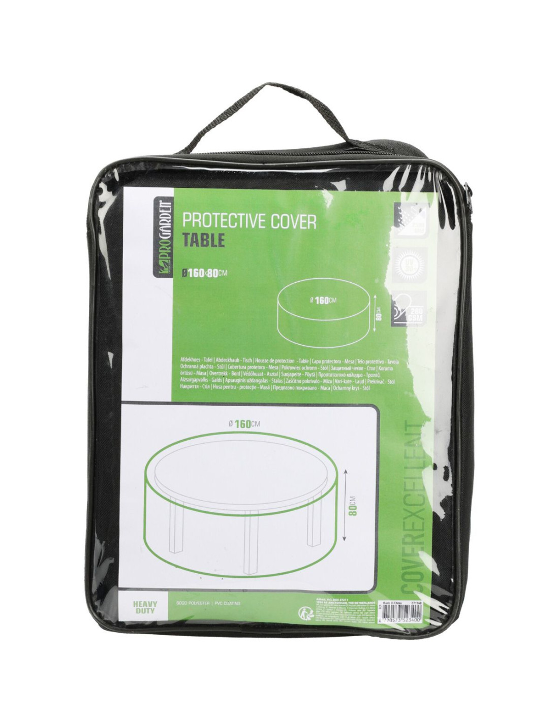 Verleng de levensduur van je ronde tuintafel met deze beschermhoes. De afmeting van de hoes is 160 x 80 cm. Deze meubelhoes is van een zware kwaliteit en is aan de binnenkant voorzien van een PVC coating, tevens is hij natuurlijk water- en uv-bestendig. beschermt tegen regen, zon, vorst, vuil en bladeren kleur afdekhoes: zwart materiaal: 600D polyester + PVC coating inside dikte: 280 GSM waterproof: 2500mm per m2 UV-protection: 30+ diameter 160 cm x H80 cm incl. opbergzak met rits