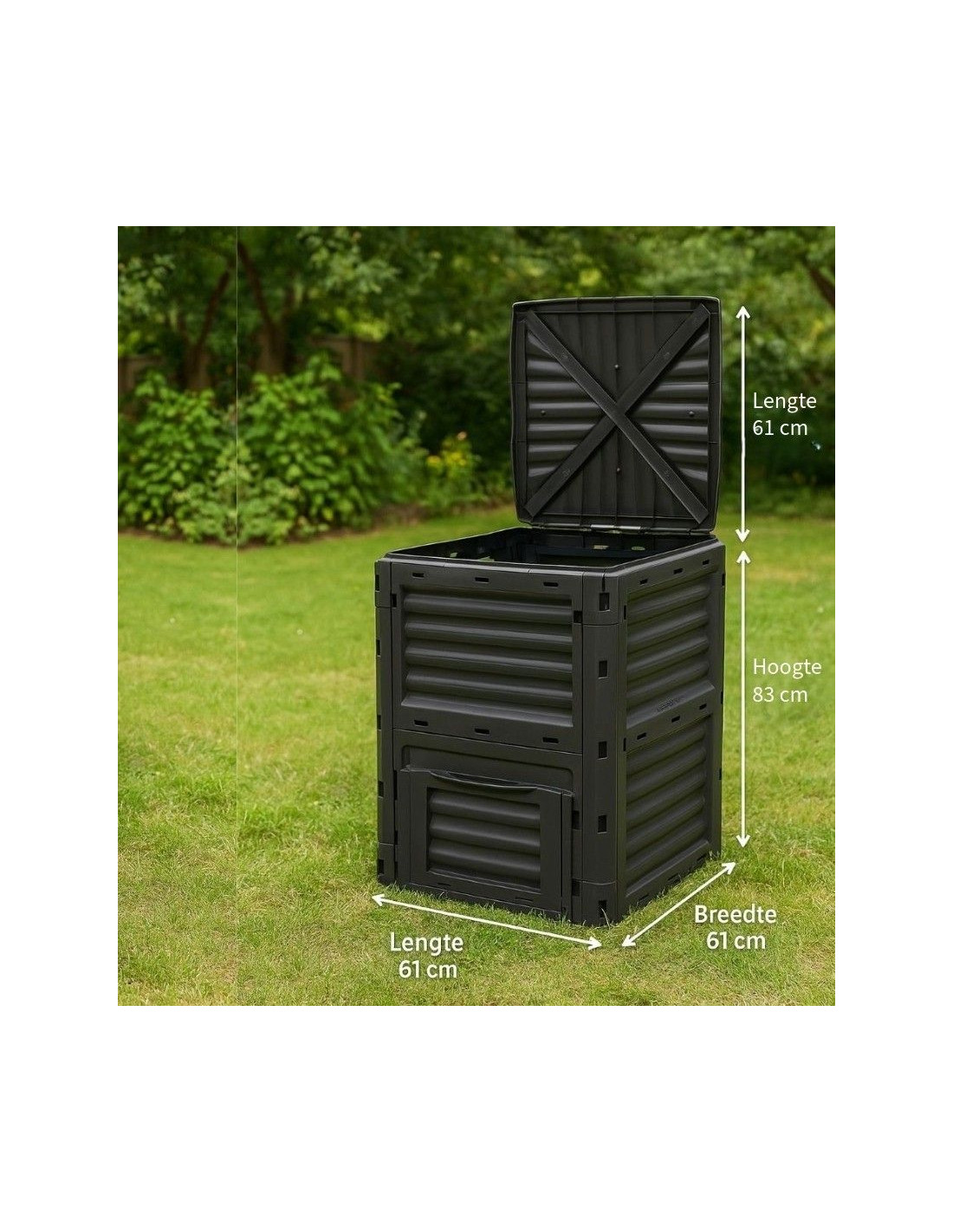 Dit compostvat van 300 liter is ontworpen voor het composteren van je groente-, fruit en tuinafval. De compostbak is eenvoudig te monteren door het handige kliksysteem. afmeting: 61 x 61 x 83cm inhoud: 300 liter type: vierkant-model materiaal: kunststof (PP) kleur: zwart kliksysteem geen bodemplaat gewicht: 6.1 kg montagetijd: 5 - 10 minuten merk: Ceruzo