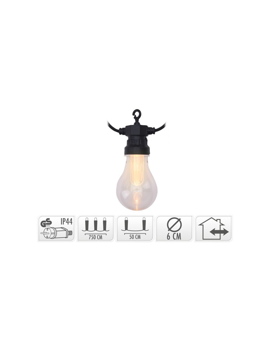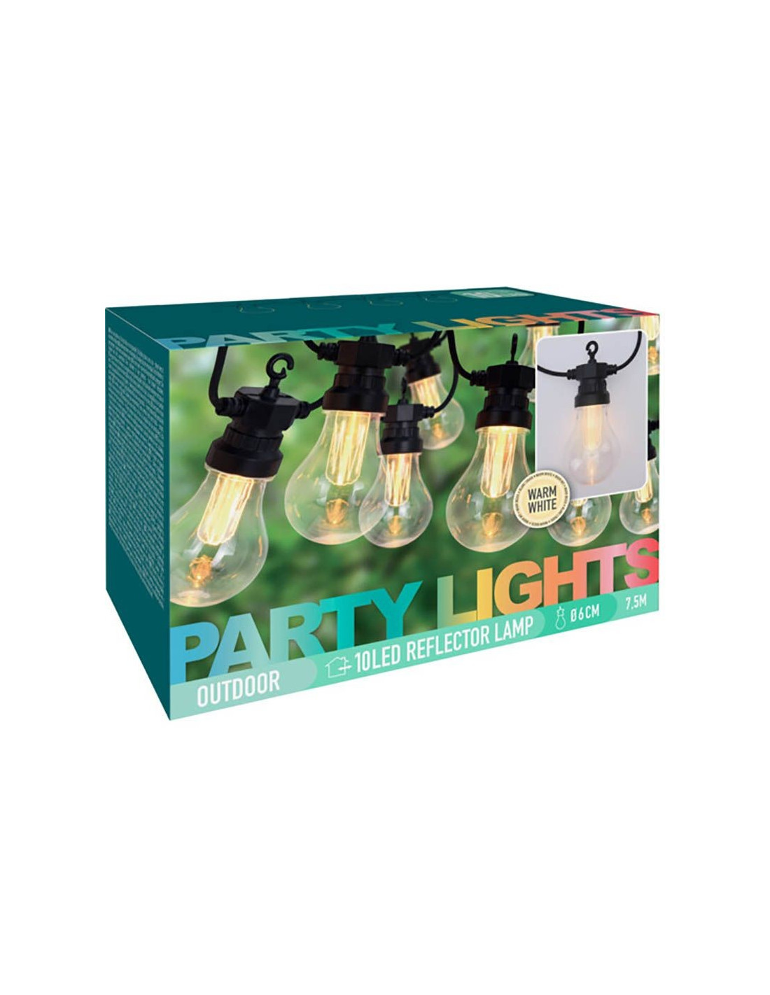 verlicht je tuin, partytent of balkon met dit feestelijke lichtsnoer aantal lichtbollen: 10 diameter lichtbol: 6 cm kleur: warm wit LED reflector lamp afstand tussen lichtbollen: 50 cm lengte aanloopsnoer: 3 meter lengte totaal: 7,5 meter aan iedere lamp zit een ophangoog, dus eenvoudig op te hangen met adapter (beschermwaarde IP44) geschikt voor buiten, met IP44 adapter