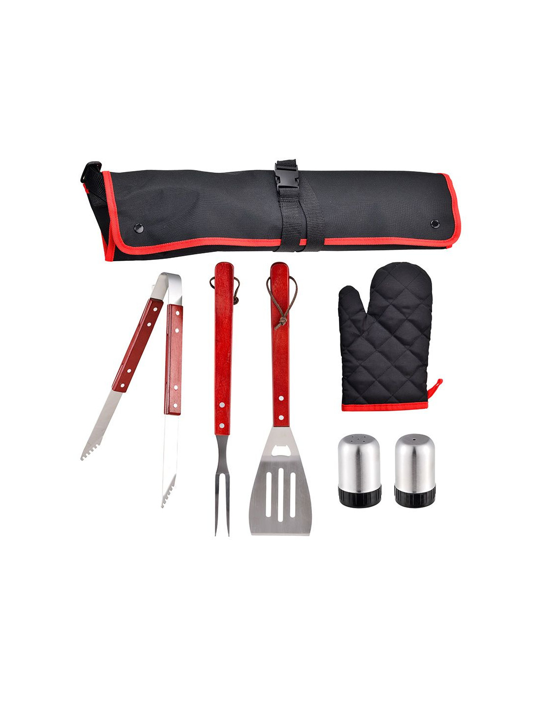 Bergner BBQ Accessoires Geschenkset, inclusief spatel, vork, vleestang, handschoen, en peper- en zoutstel. Alles wat je nodig hebt voor de perfecte barbecue-ervaring!