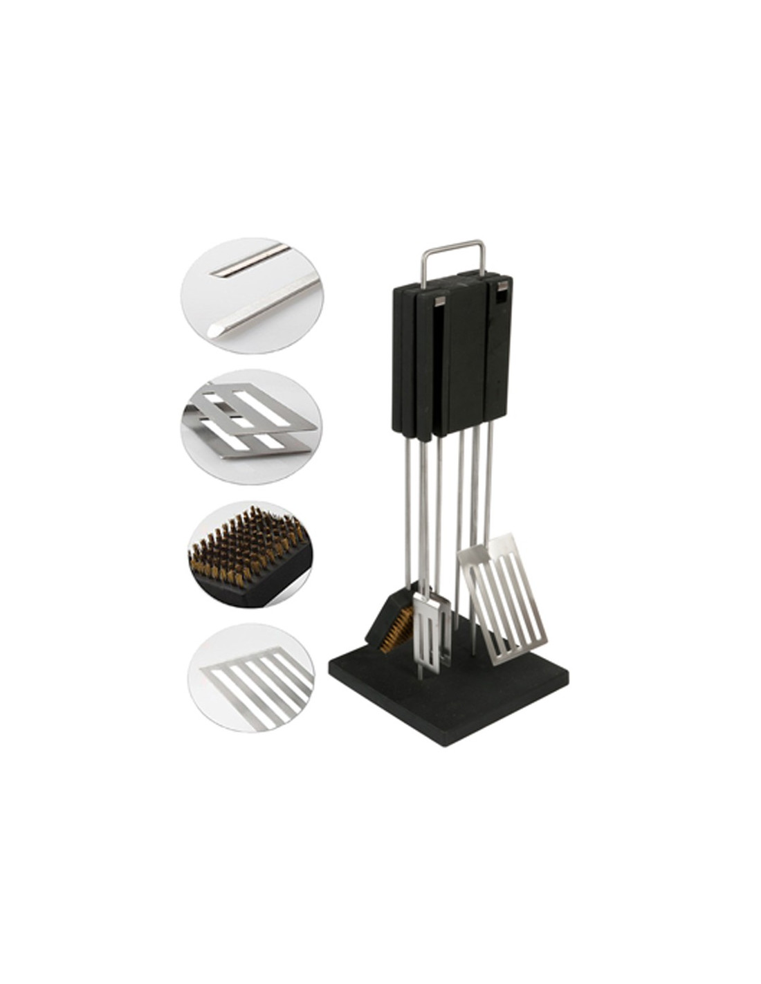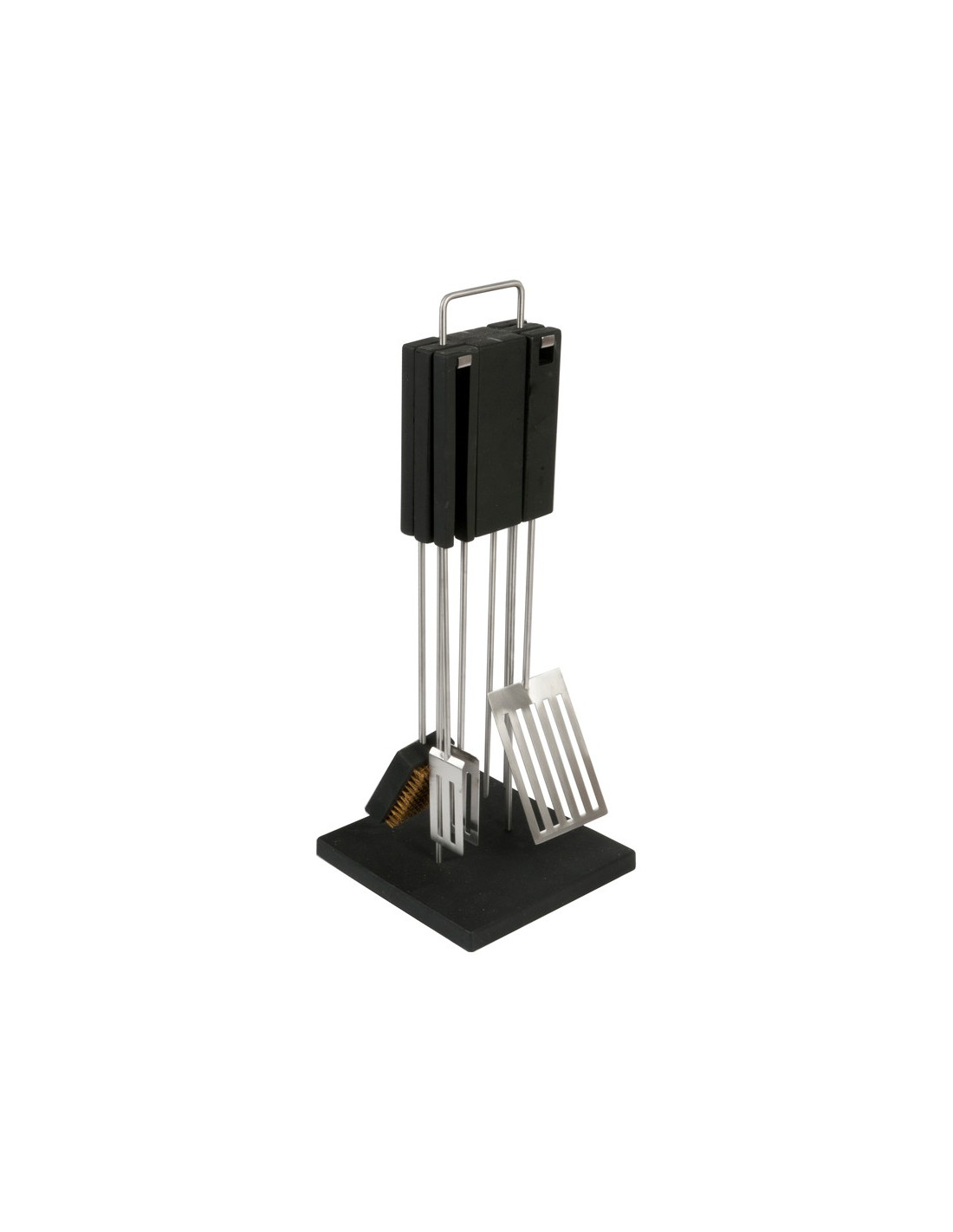 De basis meet een compacte 20x20x2cm, waardoor het eenvoudig is om de set op te bergen of op een tafelblad te plaatsen. Met een totale hoogte van de standaard van 52cm, kunnen de BBQ-tools eenvoudig en stijlvol worden opgehangen.