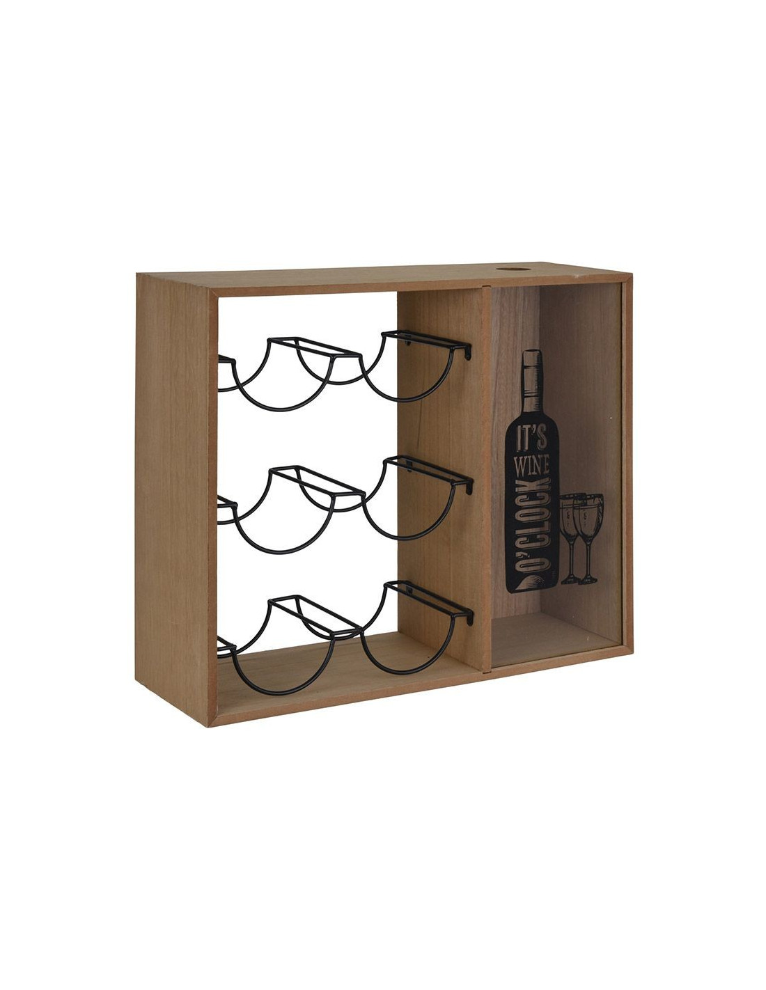 Stijlvol MDF wijnkastje met ruimte voor 6 liggende wijnflessen. Bewaar je gespaarde kurken achter een uniek glasplaatje met de print "It's wine o' clock". Perfect voor elk interieur; afmeting 40 x 15 x 35 cm.